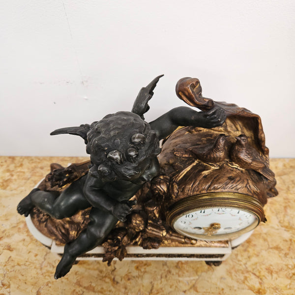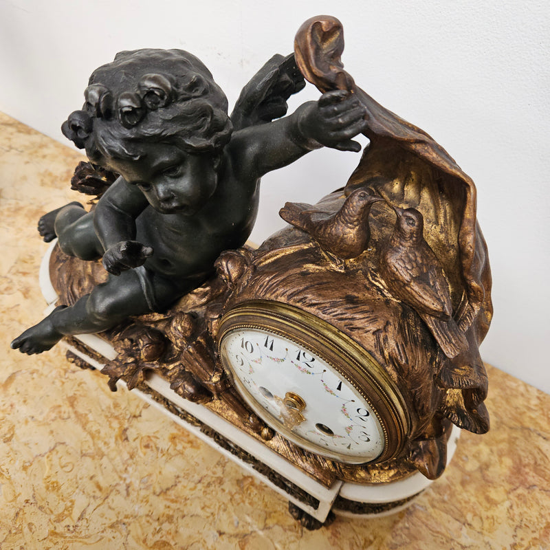 Fine quality French Cherub mantle clock in gilt metal and marble with a hand painted enamel dial. It has lovely details and is in good original condition.
