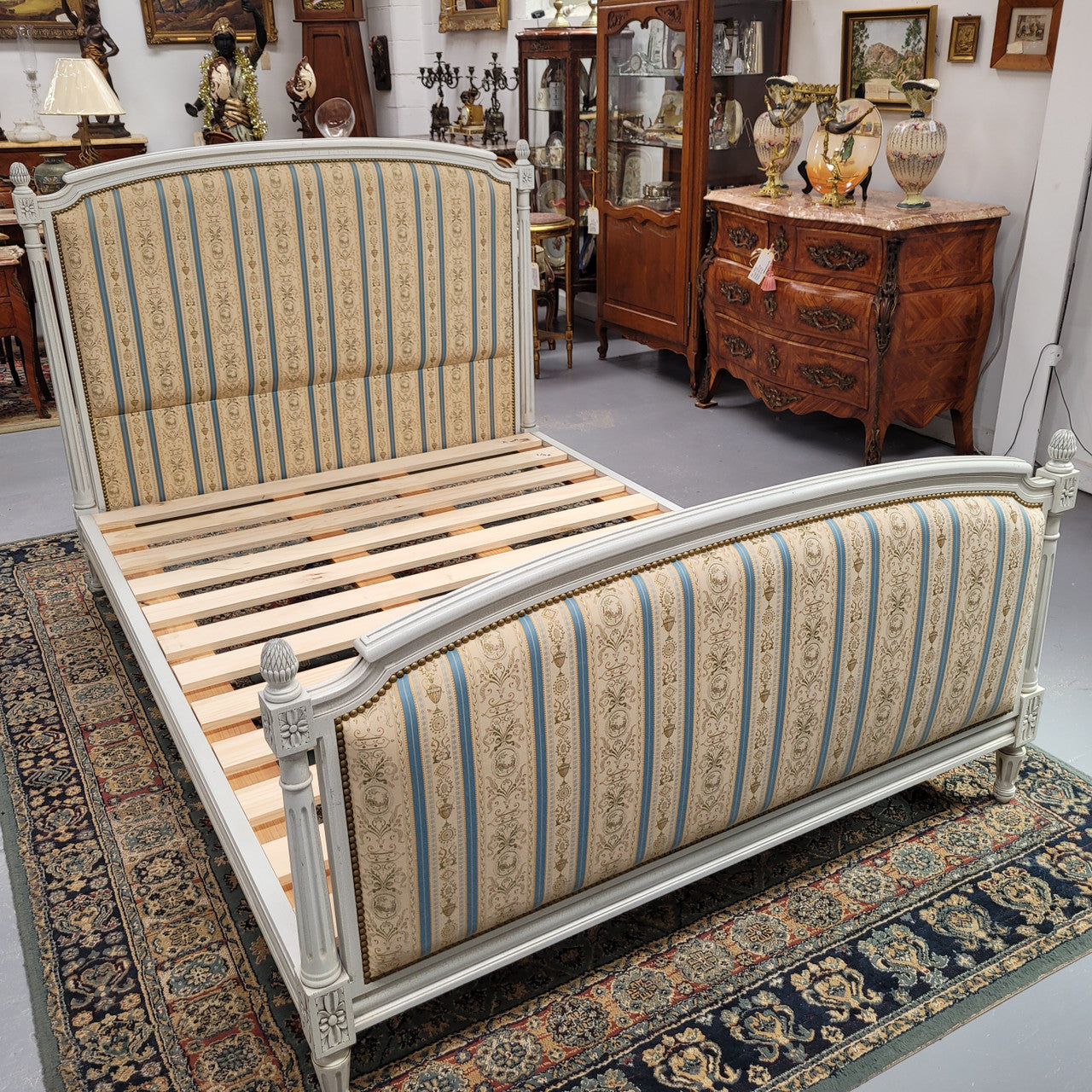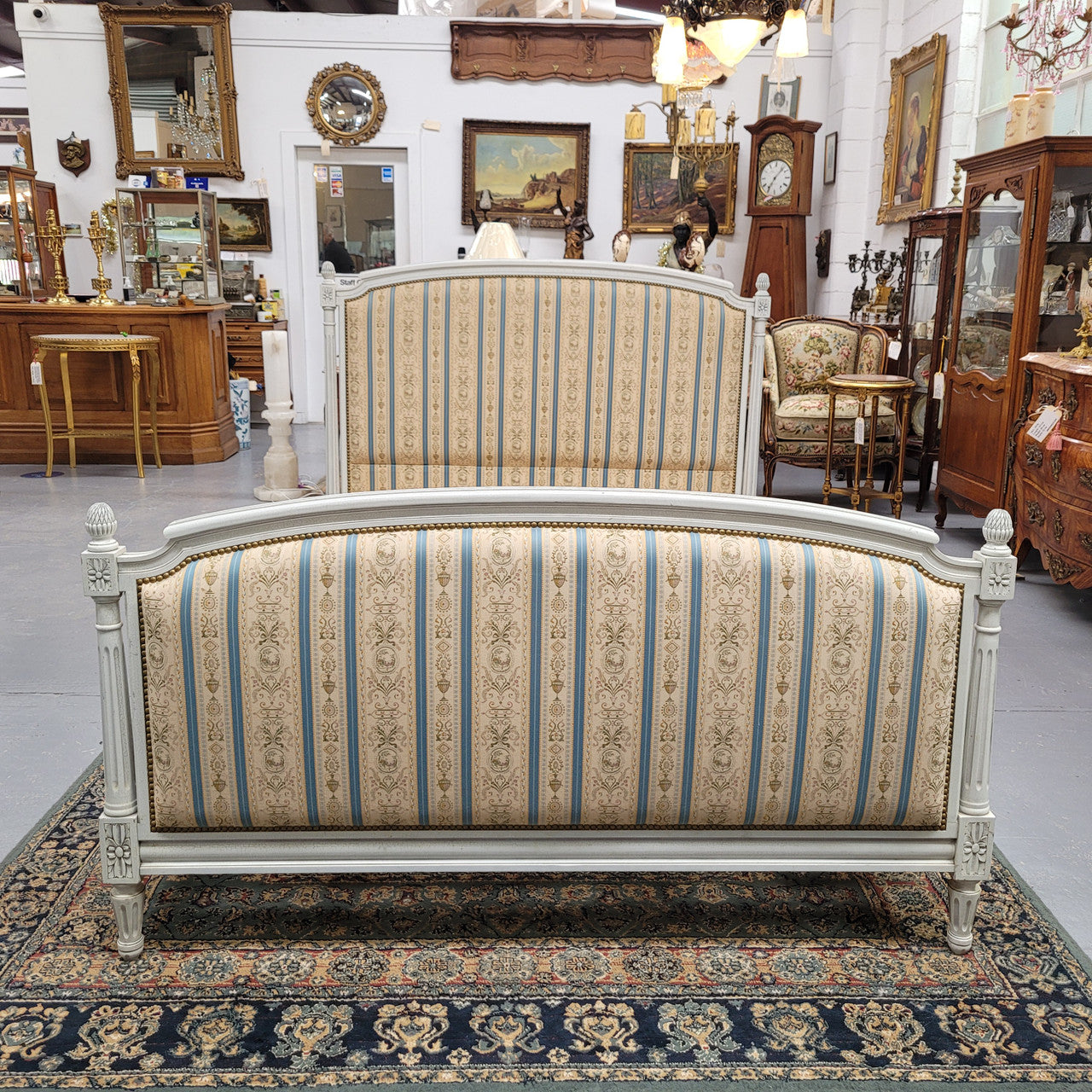 French Louis 16th style double bed and rails with original crackle paint. It also has good quality upholstery. Bed comes complete with custom made slats. Just place your mattress on top. Sourced from France and in good original detailed condition.