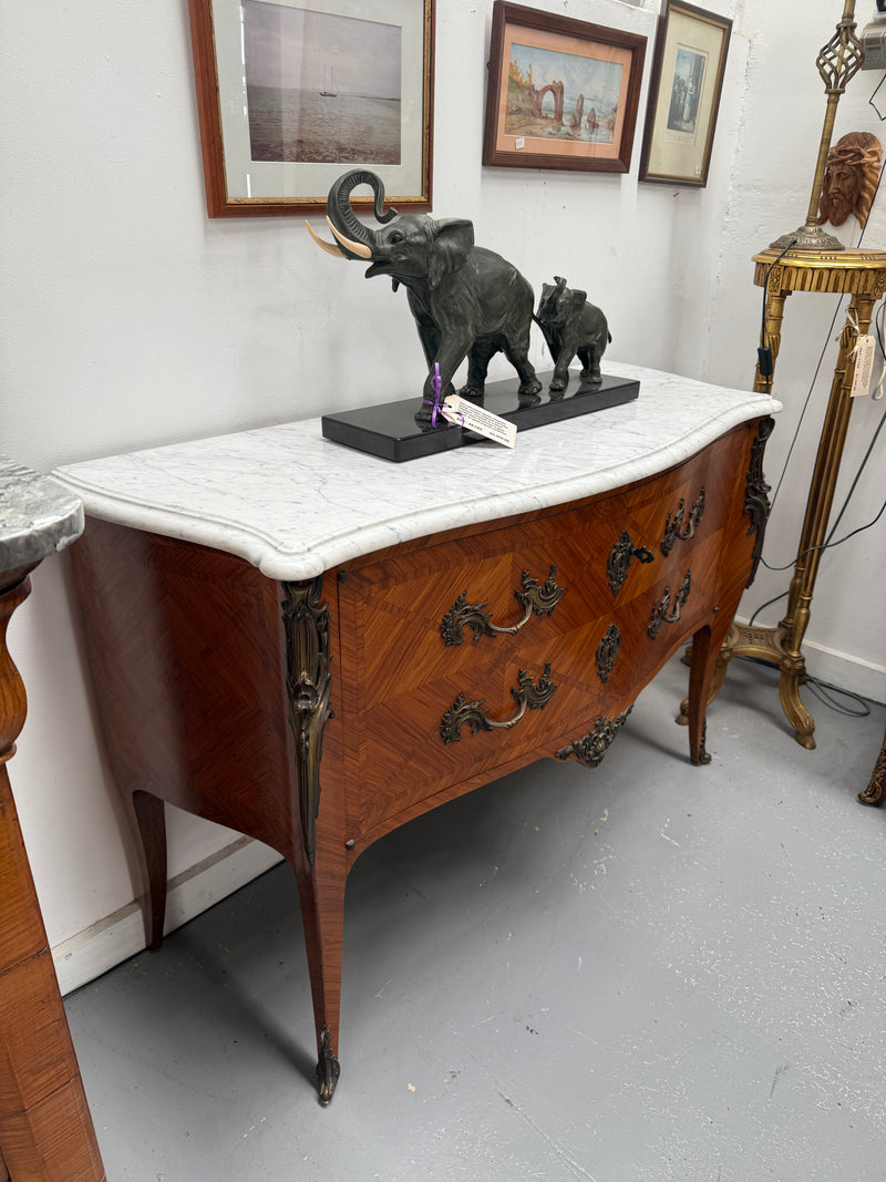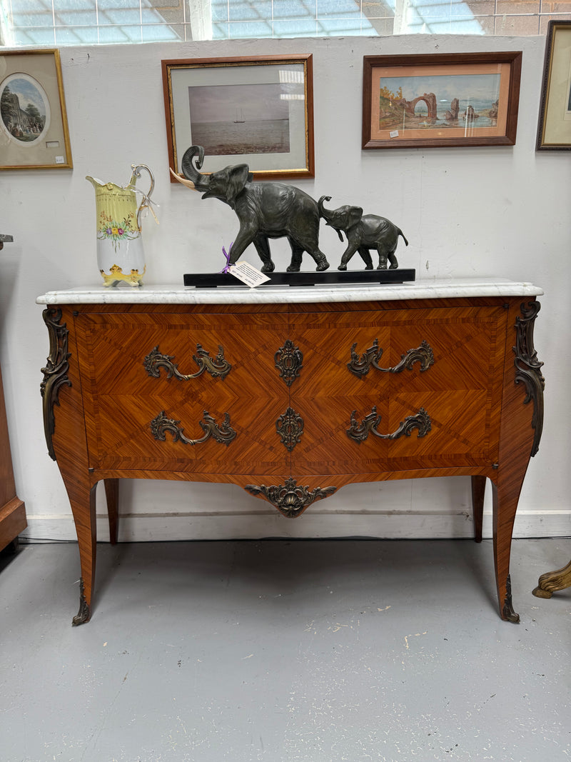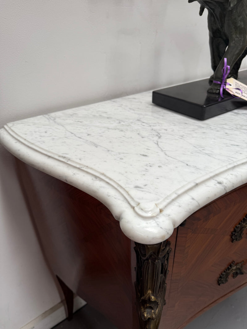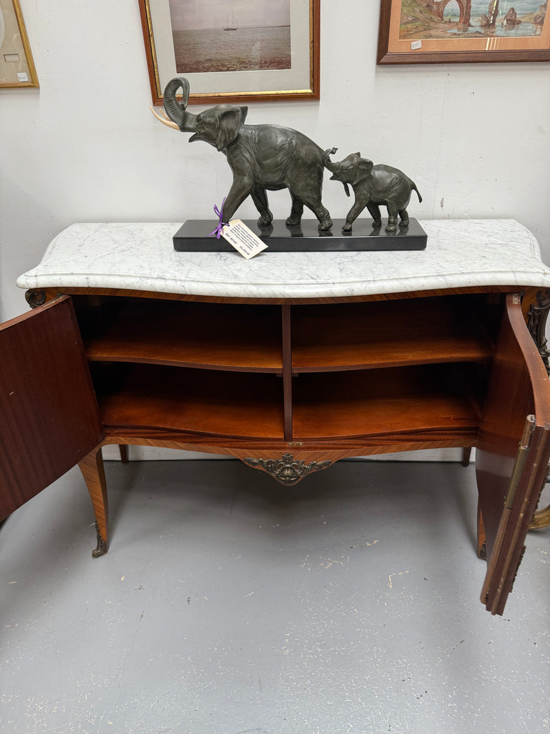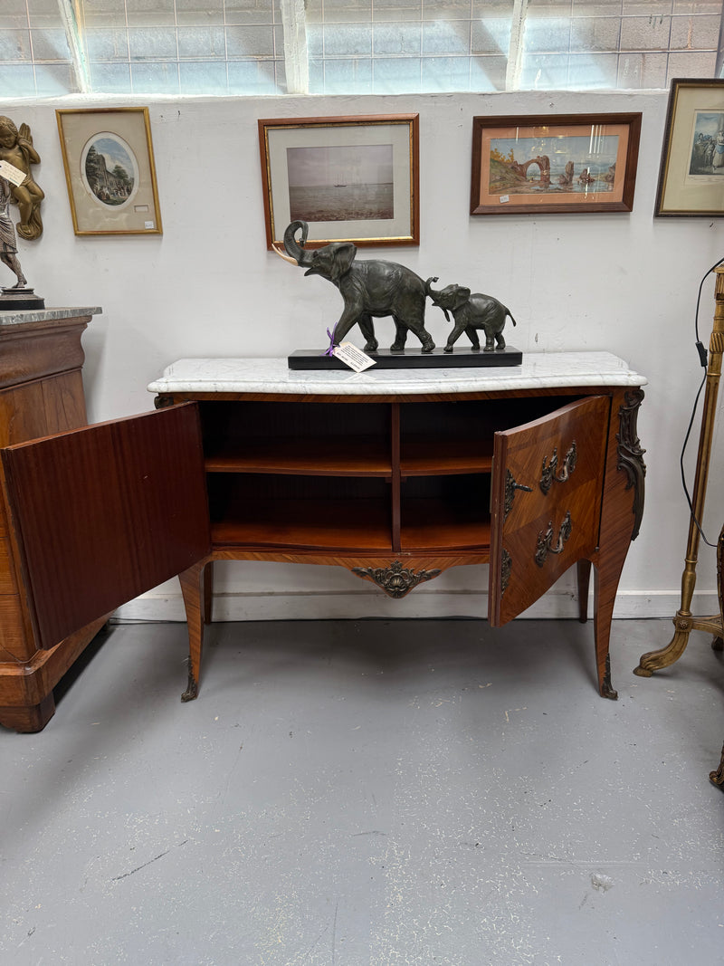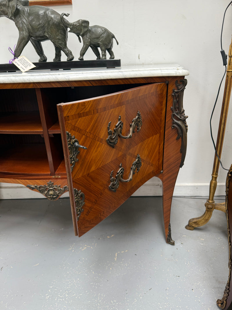 Unusual French Louis XV style parquetry commode style side cabinet. Presents like two drawers but is in fact a two door cupboard - when opened reveals four shelves. Surmounted by an attractive white marble top. In very good original condition. Please see photos as they form part of the description and condition.