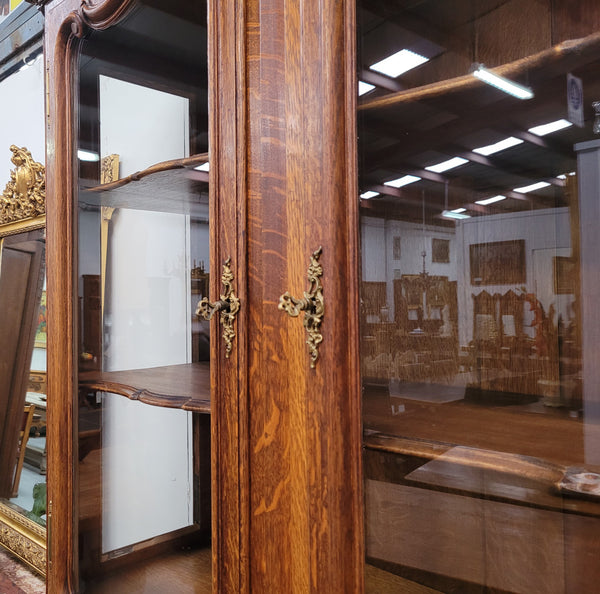 Impressive French Oak Louis 14th Style Display and Sideboard. It has 4 drawers, 2 bottom cupboards with 6 total shelves and 3 display doors with 3 shelves. In good, detailed condition.