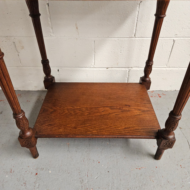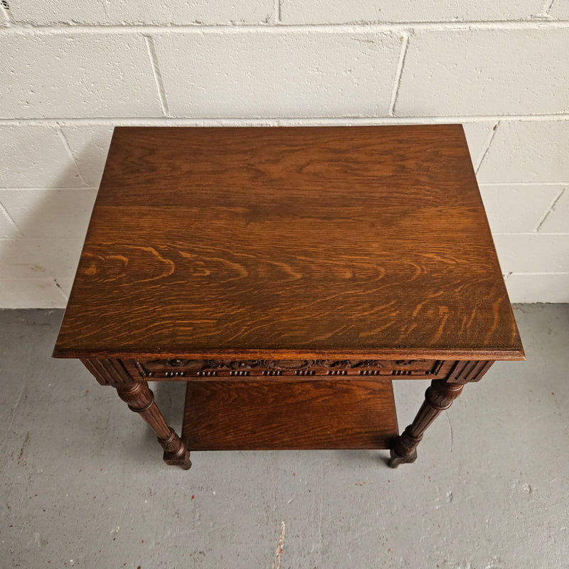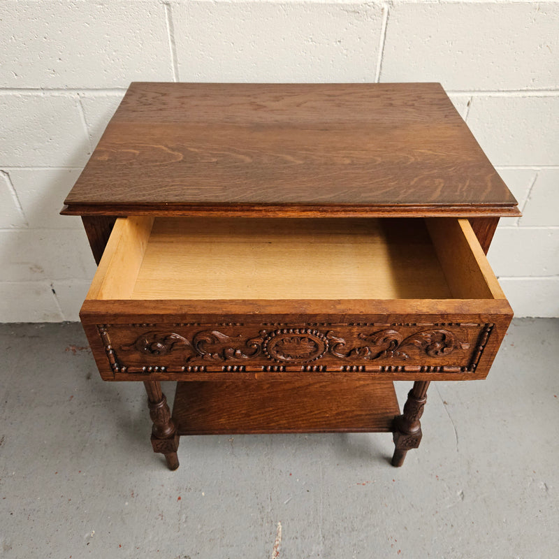 French Oak Louis XVI one drawer side table featuring beautiful carvings. It has been sourced from France and is in good original detailed condition. Please view photos as form part of the description and condition.