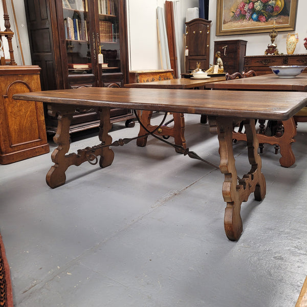 French Oak Spanish Style Farmhouse Dining Table With Decorative Iron Work Underneath