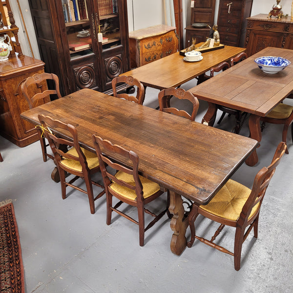 French Oak Spanish style farmhouse dining table with beautiful iron work underneath. It has been sourced from France and is in good original detailed condition. Table can seat six people very comfortably and could sit eight if required. Please view photos as they help form part of the description.