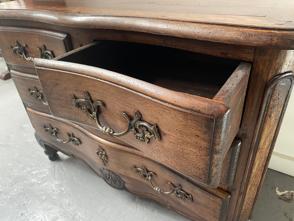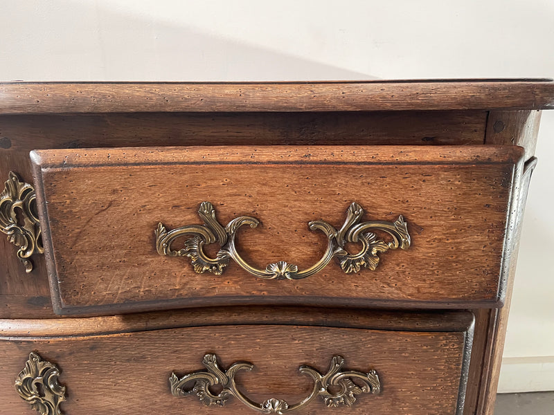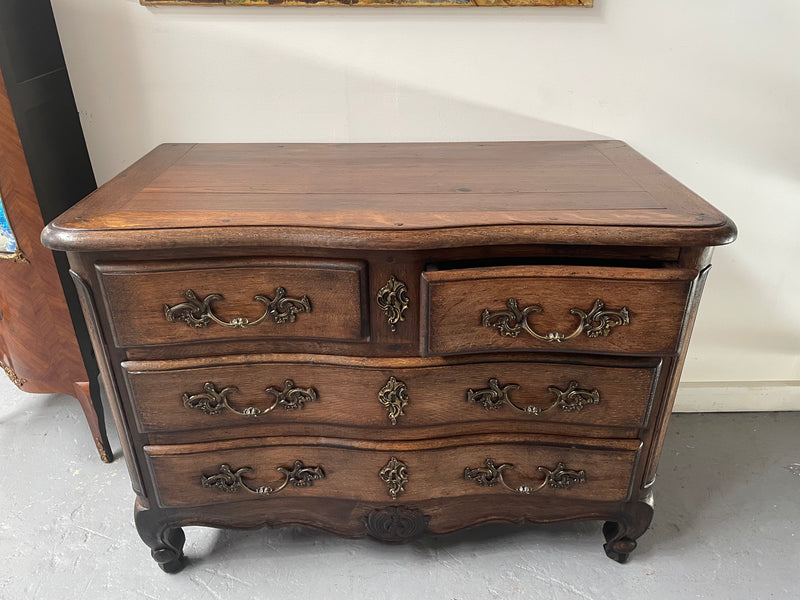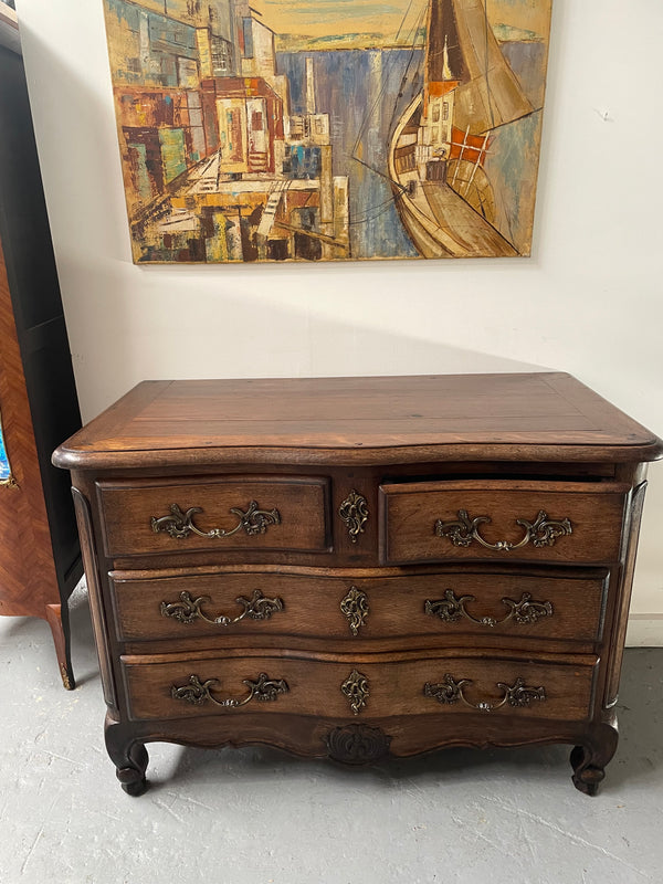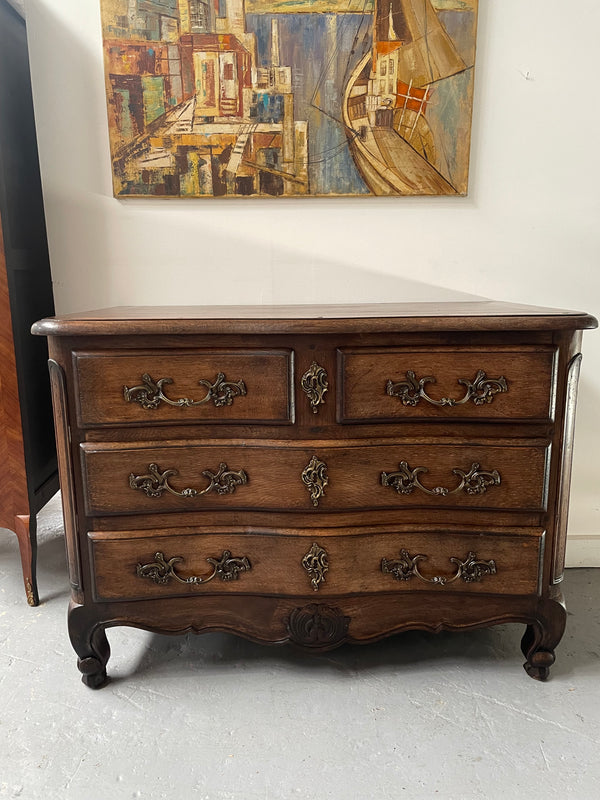 Lovely French Provincial oak four drawer chest of drawers. It has decorative mounts and is in good original condition for its age. Please see photos as they form part of the description.
