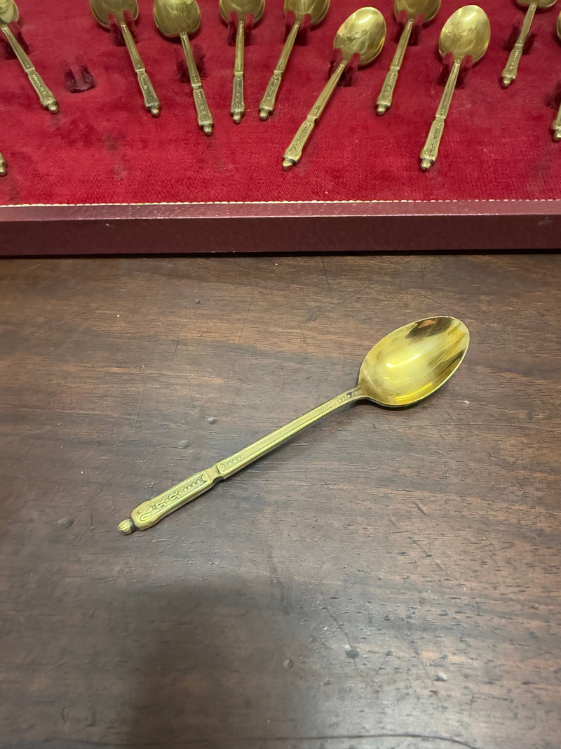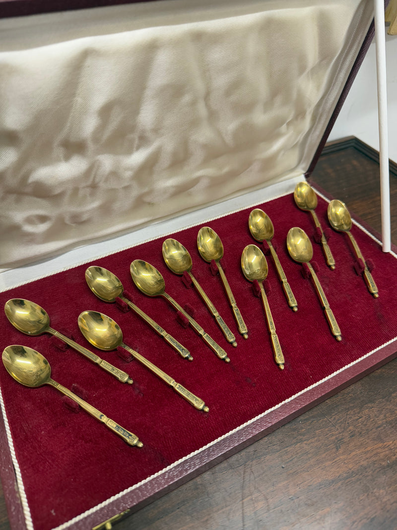 Stunning set of 12 vintage French (Vermeil) heavily gold plated demitasse spoons, it is in the original box and in good original condition. Please see photos as they form part of the description.