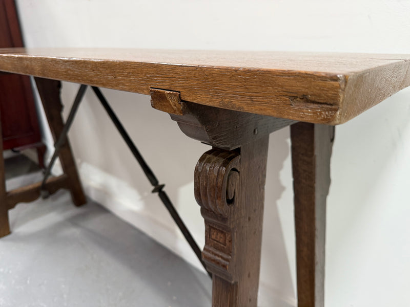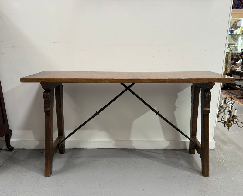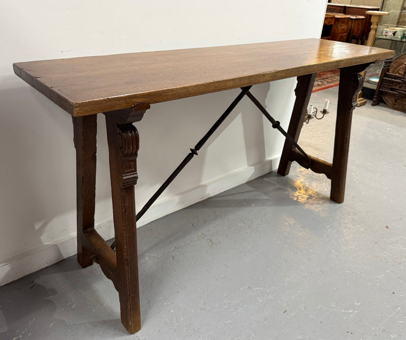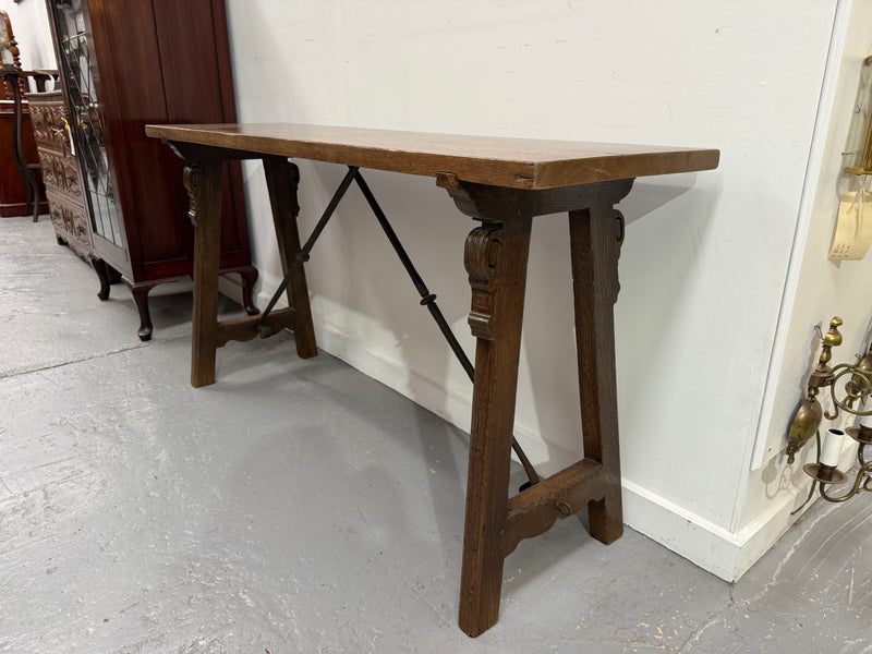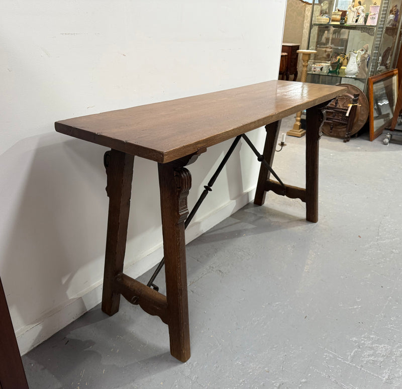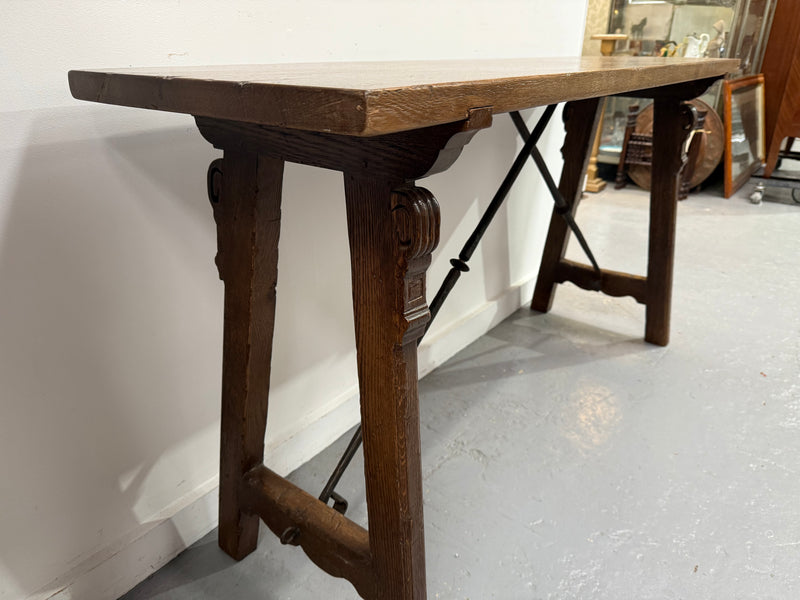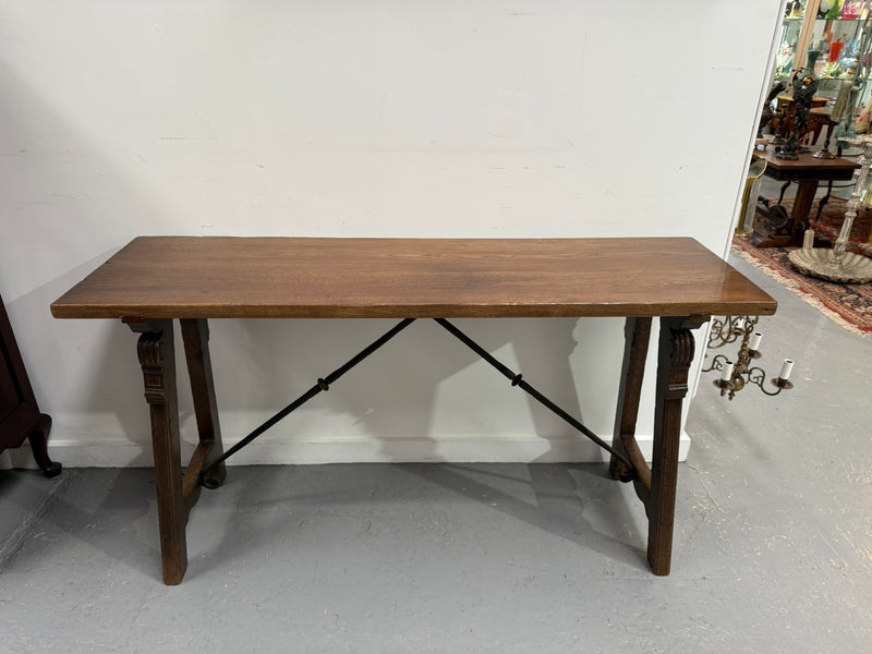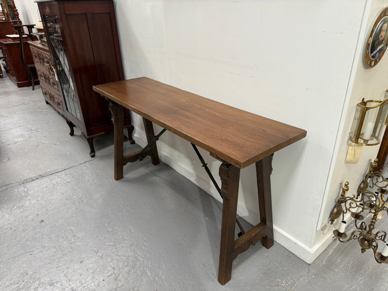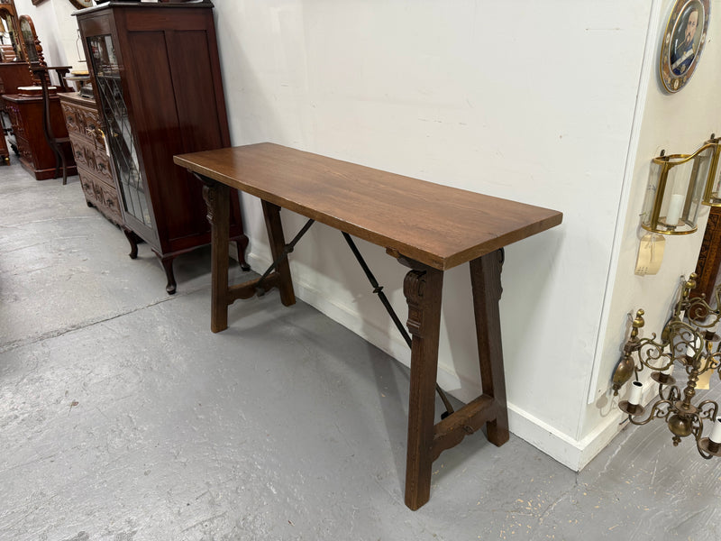 Practical French Spanish style console table with elegant ironwork and of pleasing narrow portions. In good original condition. Please view photos as they form part of the description and condition.