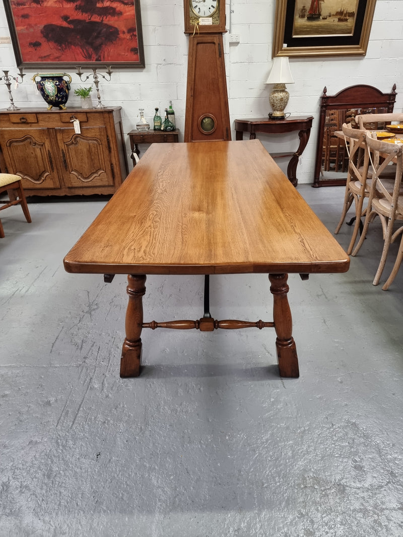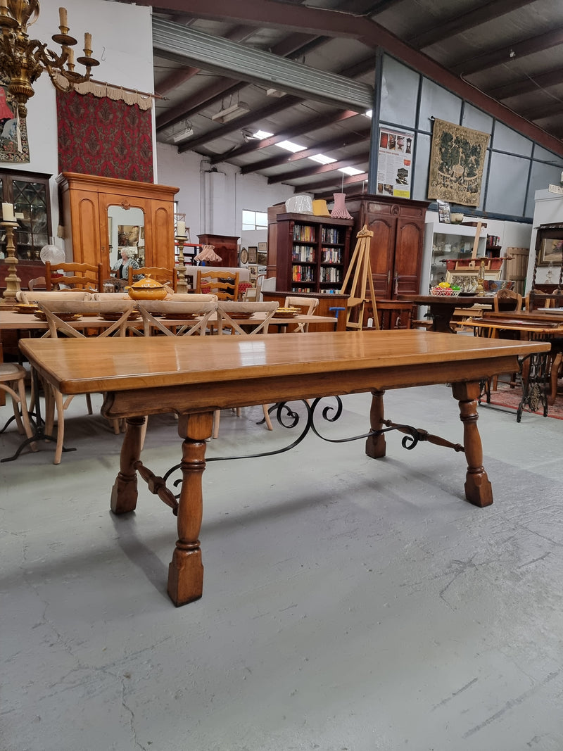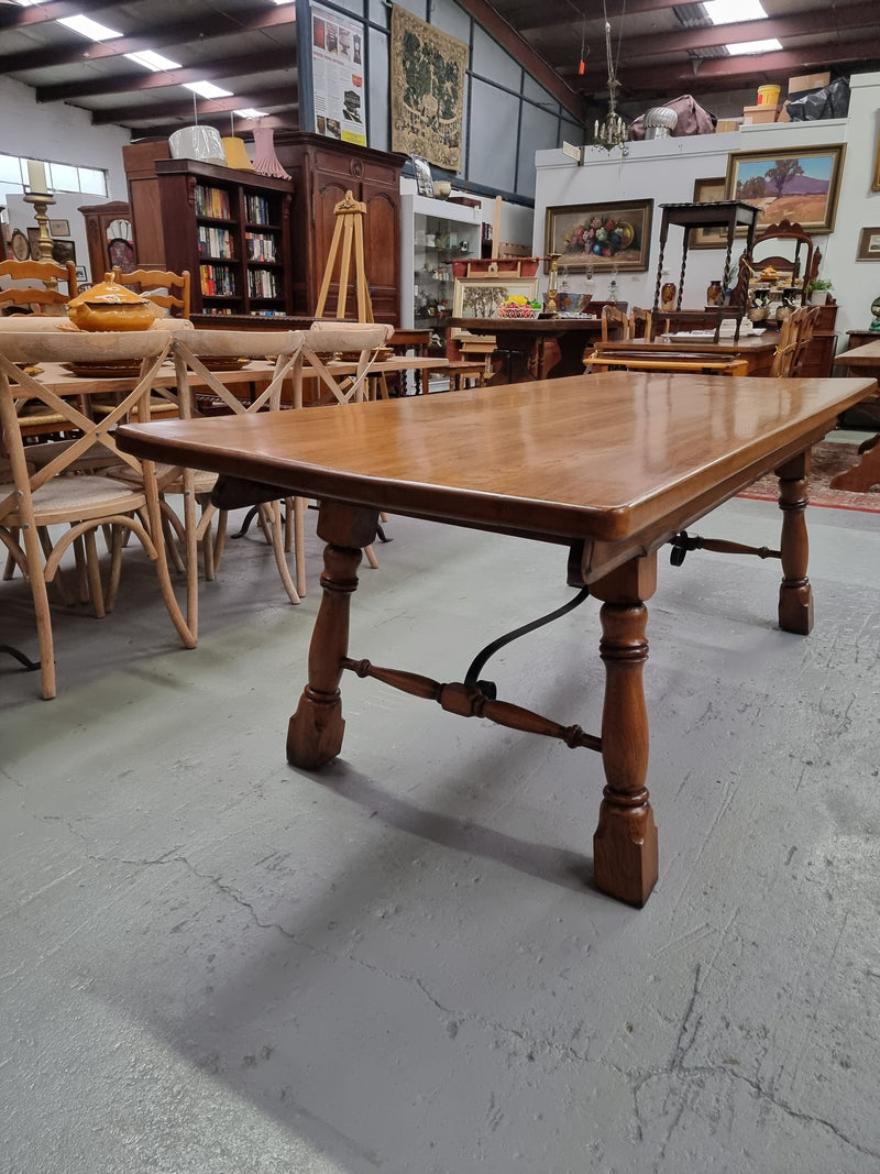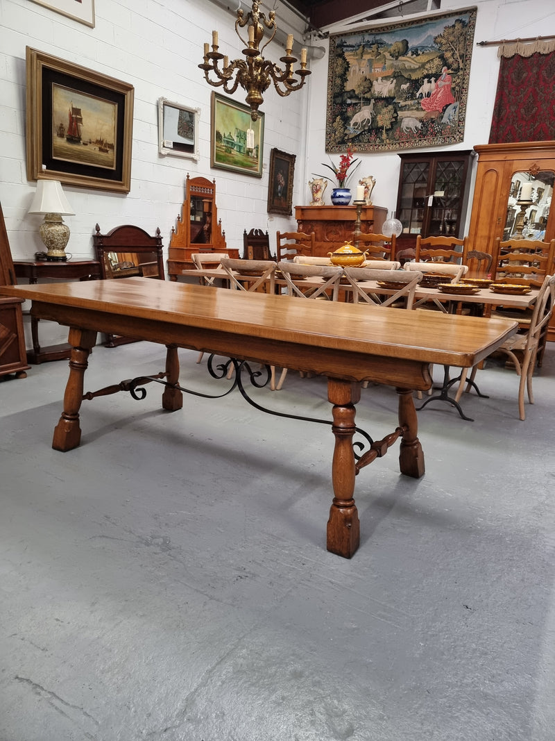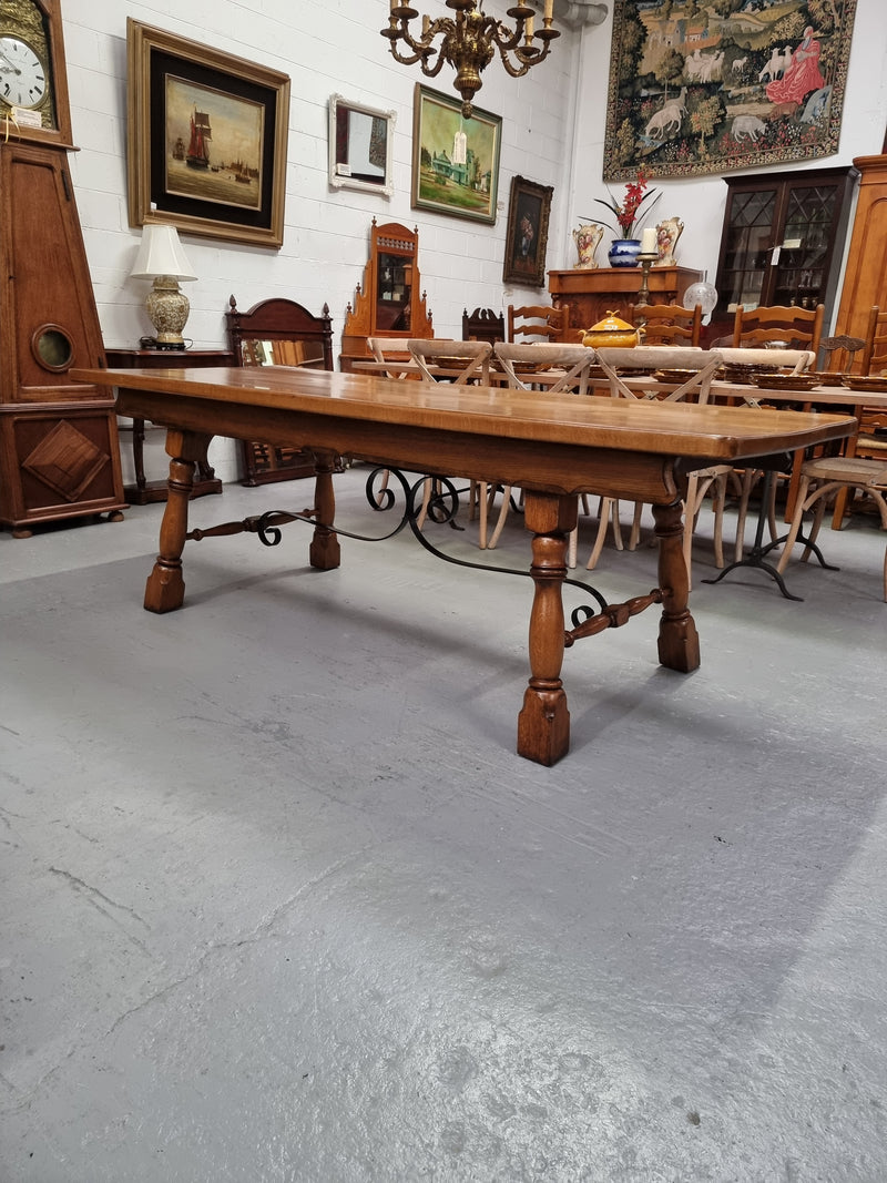 1930's French Spanish style Oak farmhouse table. Features a wrought iron stretcher. In good original condition. Please see photos as they form part of the description and condition.
