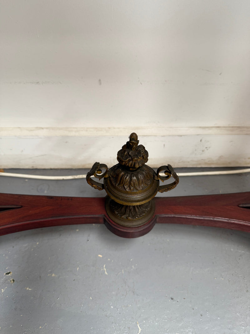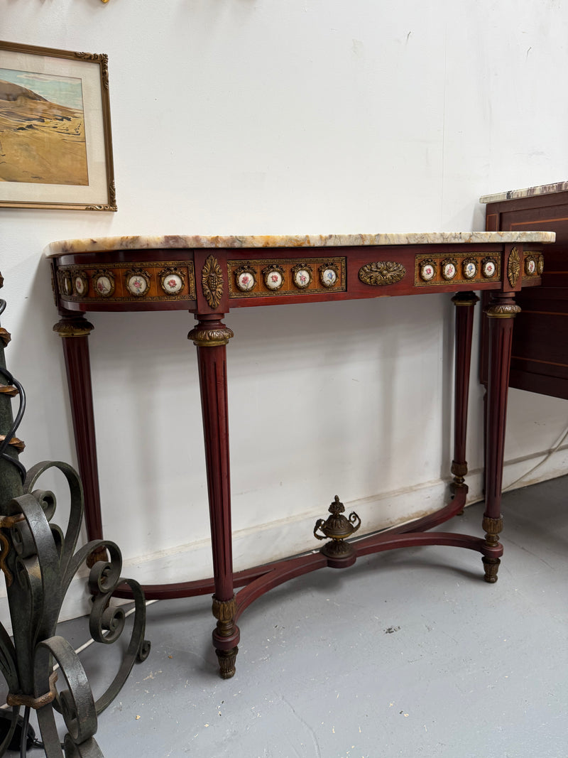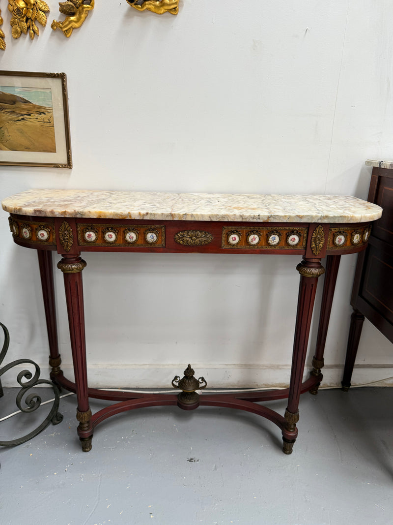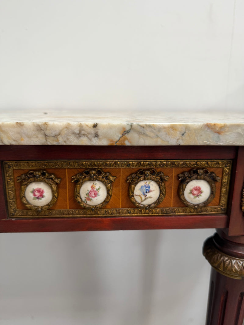 Attractive Mahogany console table with marble top and ormolu trims, and Limoges style ceramic panels. In the French style. This is one of a pair but they are priced separately at $1495 each.