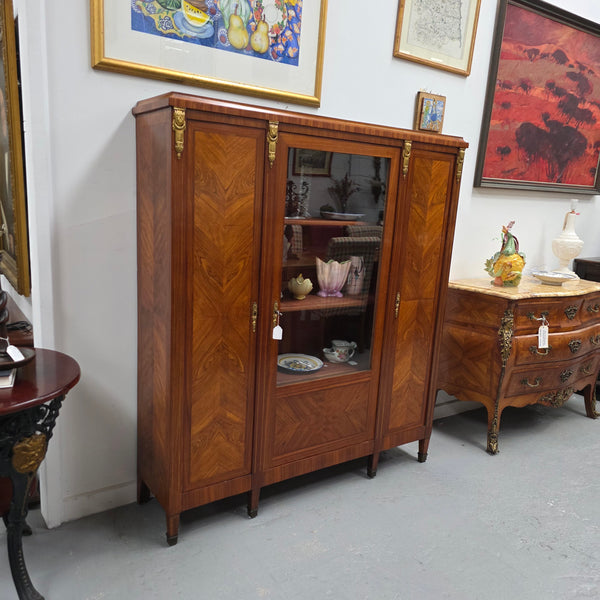 French Walnut Louis 16th bookcase with inlay and ormolu mounts. Featuring a glass door in the middle. It has three fully adjustable shelves and is in good original condition. Please view photos as they form part of the description and condition.