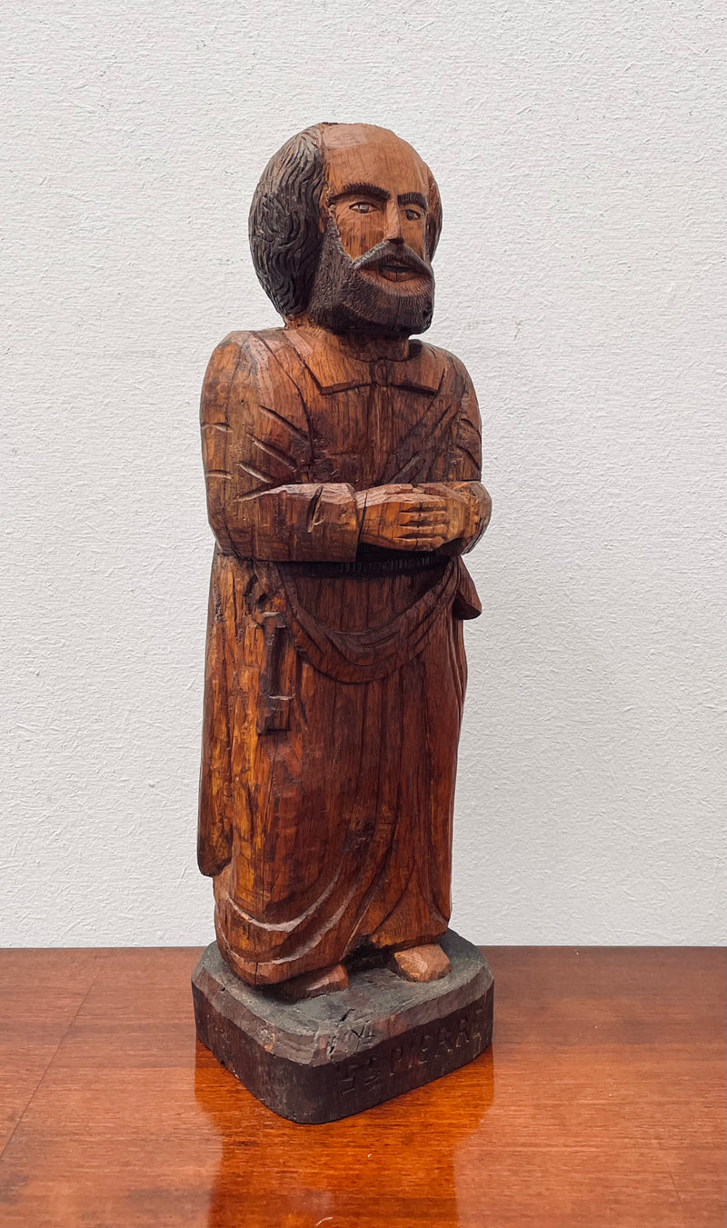 Interesting antique hand carved wooden state of St. Pierre. (St Peter with key). Very dense wood and carved script of "P. Bonne vie". Wood is split commensurate with age but in good original condition. See Photos as they form part of the description.