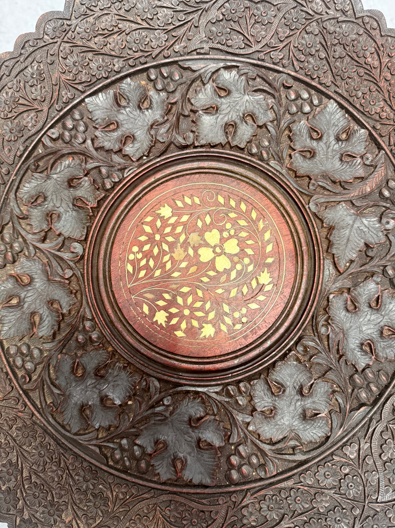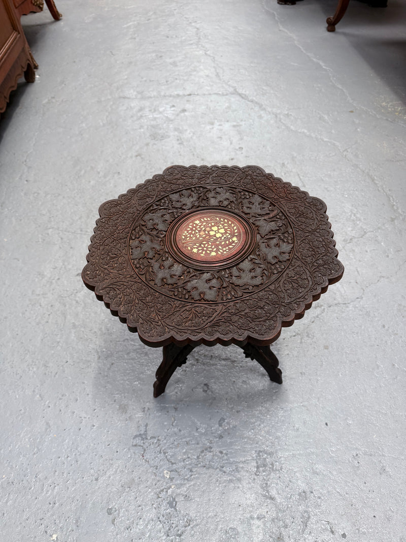 Stunning finely hand carved hardwood side table with floral details and bone inlay in the centre. It is in good original condition. Please see photos as they form part of the description and condition.