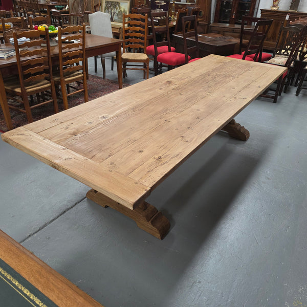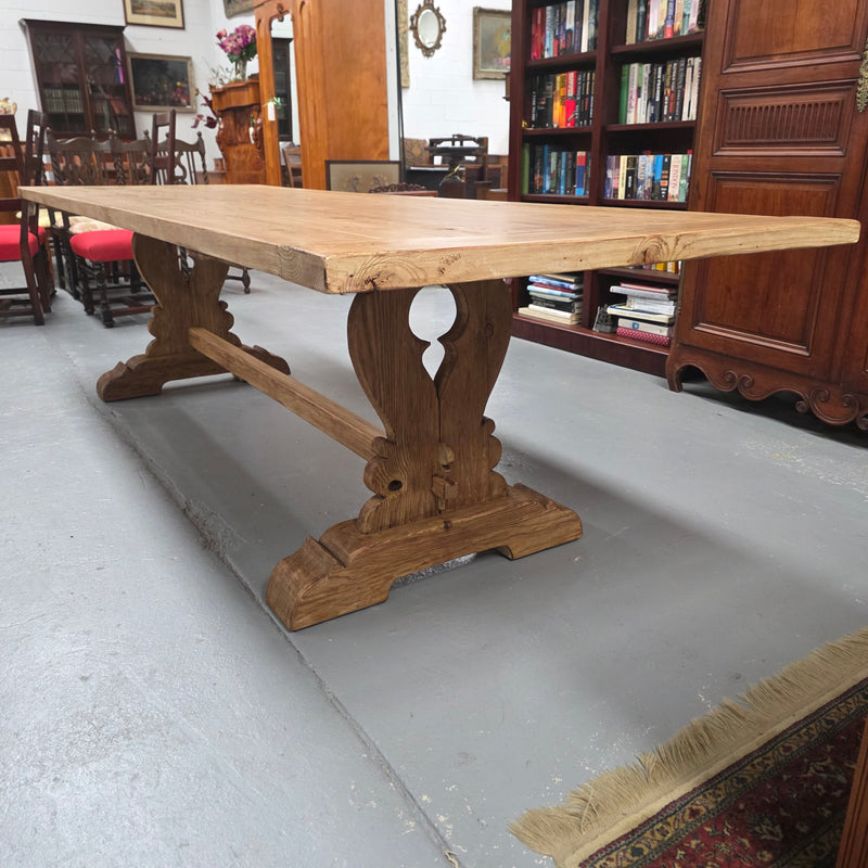 Impressive vintage reclaimed spruce three meter dining table. It is in the monastery style with a practical wax finish. It seats 12 persons comfortably. It has a width of 100 cm and would be great for entertaining. In excellent condition. Please see photos as they form part of the description and condition.