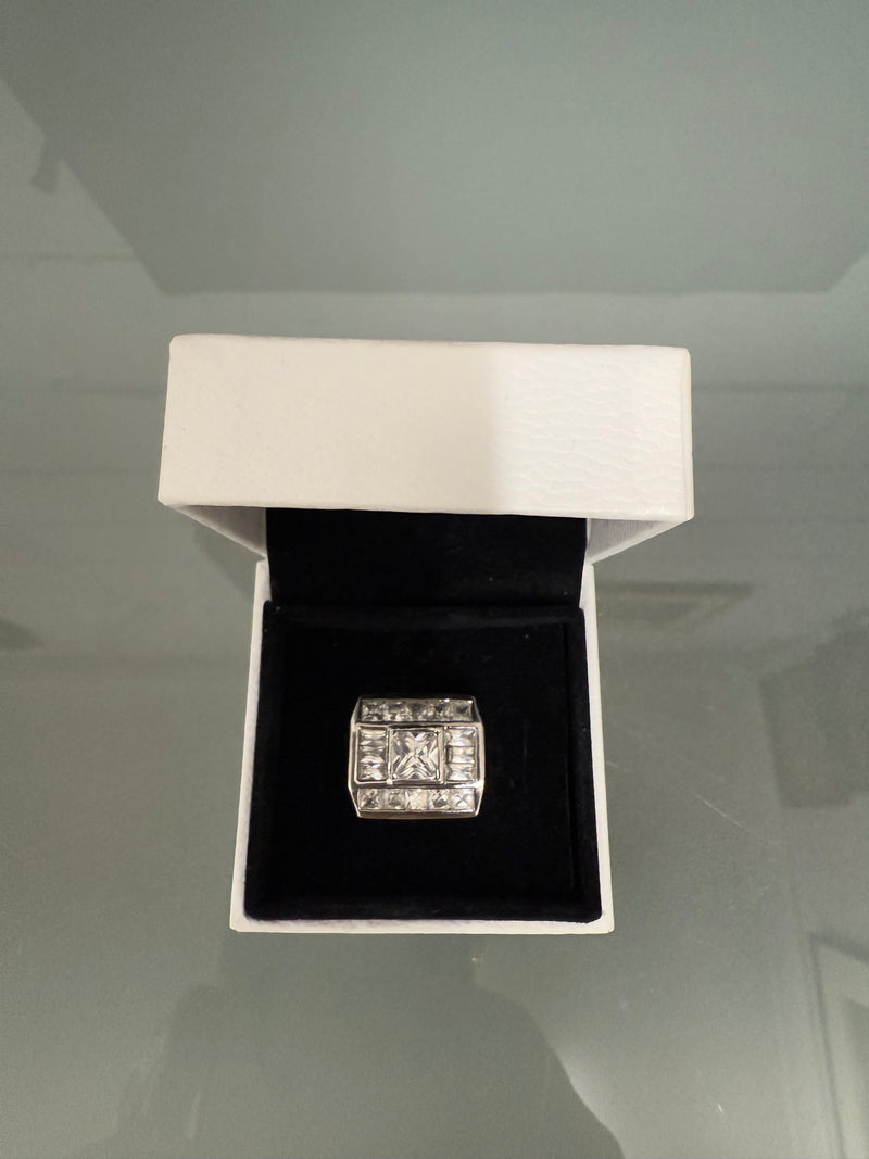 Impressive silver ring with a square top containing square, round & baguette white stones. In good original condition. Please see photos as they form part of the description.