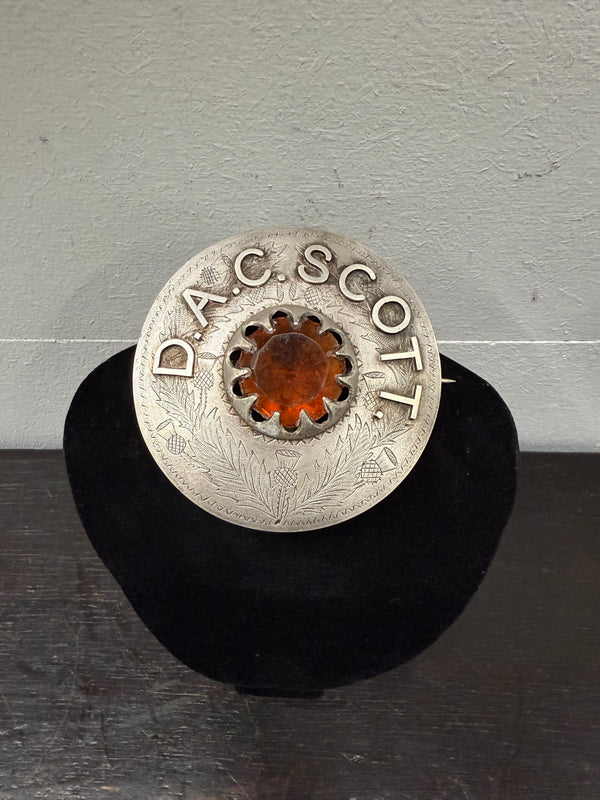 Large antique silver Scottish clan brooch with makers mark engraving and coloured stone. In good original condition. Please see photo as they form part of the description and condition.