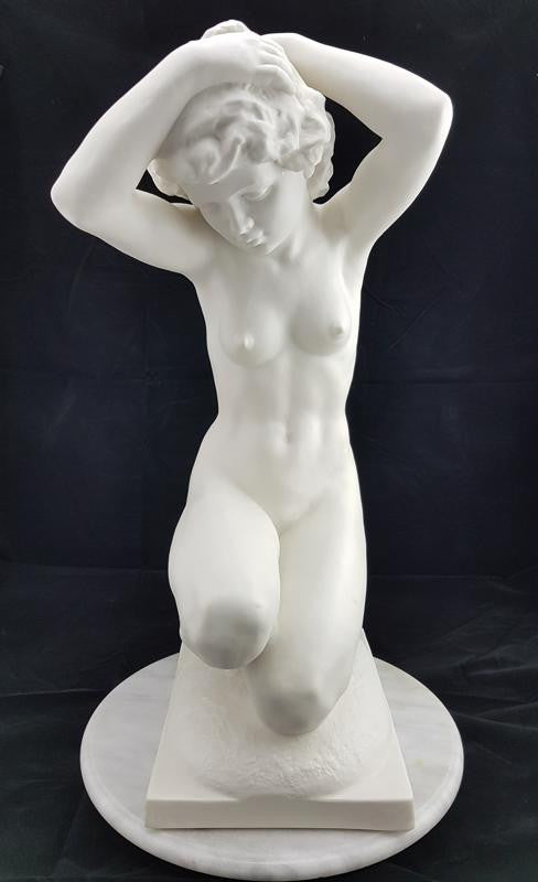 A vintage Art Deco nude figurine designed by Karl Tutter for the porcelain company Hutschenreuther in the 1930's.  The original name of the figurine is “Nach dem Bade†translating into “After The Bathâ€. Tall figurine standing at 52 cm high and in good condition. Karl Tutter (1883-1966) was one of the most famous porcelain modelers of the 20th century. He participated in exhibitions in Prague, Munich at the Great German Art Exhibition, the House of German Art, as well as in Regensburg, Bayreuth, Kulmbach and elsewhere.