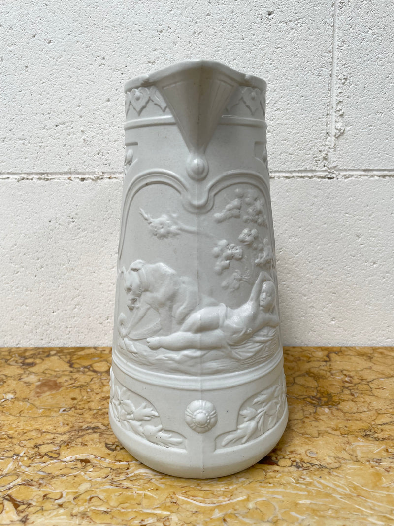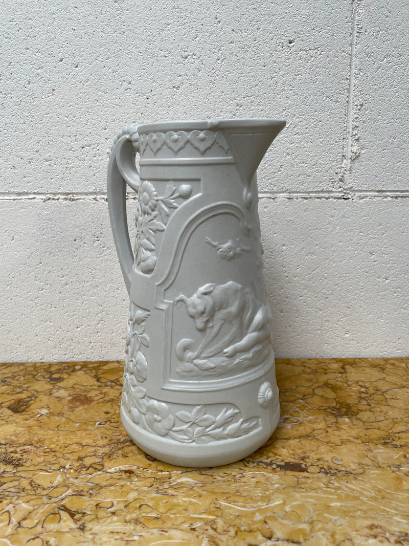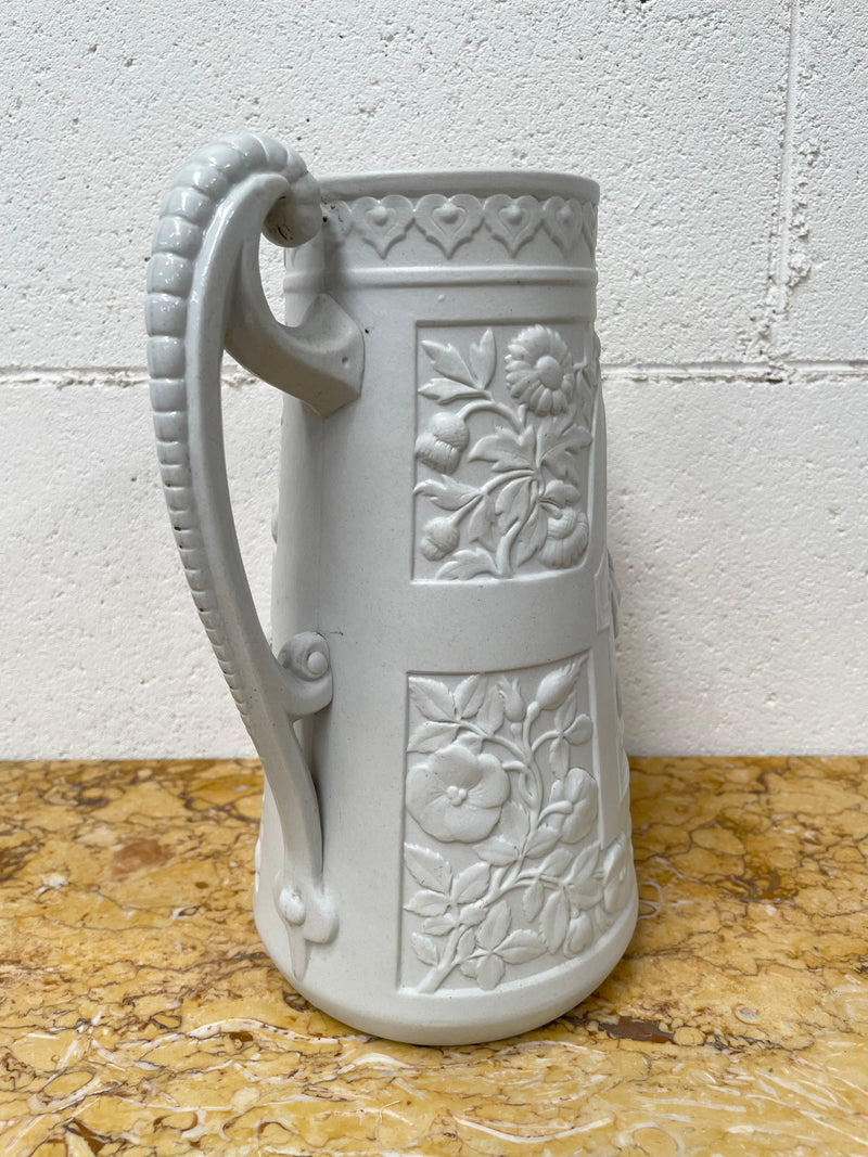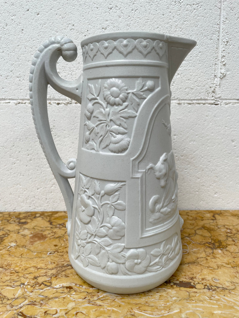 Large Moulded stoneware pitcher featuring romantic scene and floral panels, with decorative handle. In good condition. Please see photos as they form part of the description.