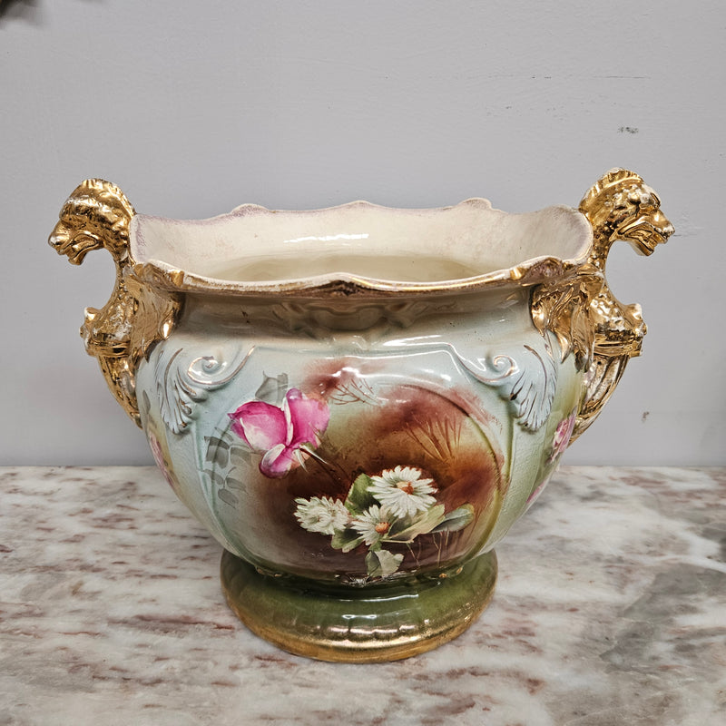 Stunning large Victorian jardiniere with gilt dragons on the handles and a beautiful floral design all around, it has an old repair to one of the dragons heads with a crackline. It has fading due to age and crazing. Please see photos as they form part of the description.