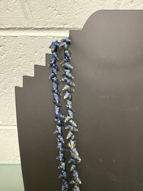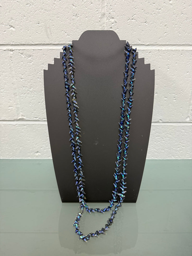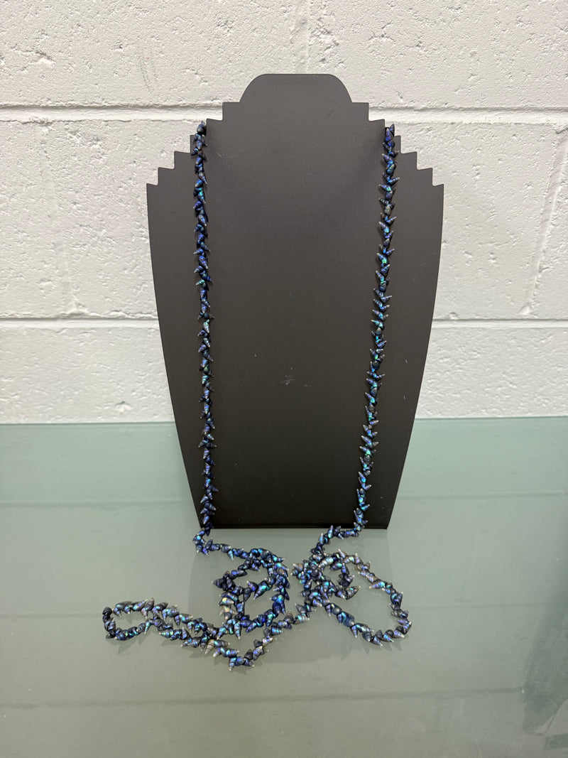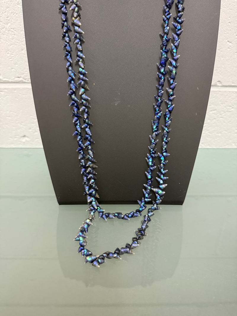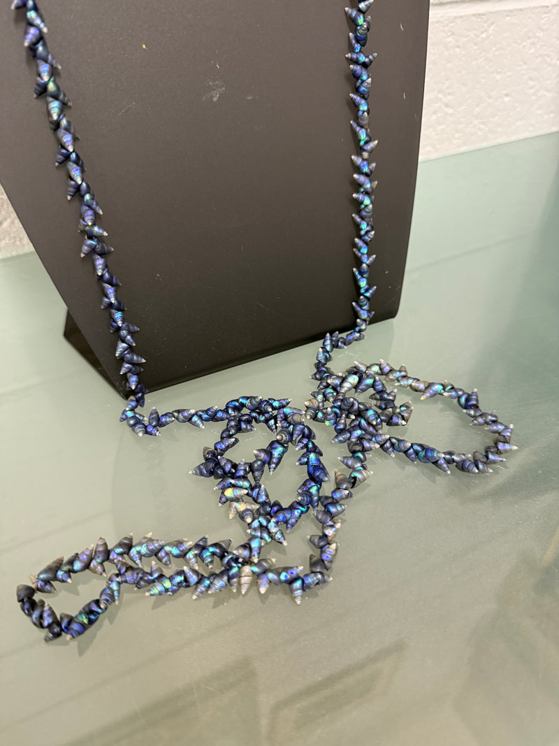 Long (166cm) vintage Tasmanian Aboriginal Blue Shell Maireener Iridescent Necklace. In good original condition. Please see photos as they form part of the description.