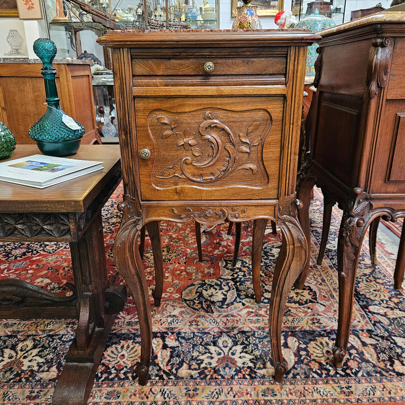 Stunning Louis XV style walnut bedside cabinet with inset marble and beautiful carvings. It has one drawer and one cupboard. In good original detailed condition. Please see photos as they form part of the description and condition.