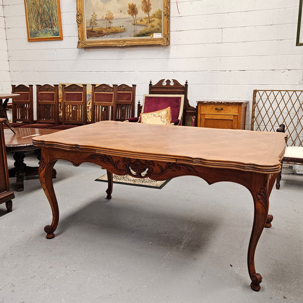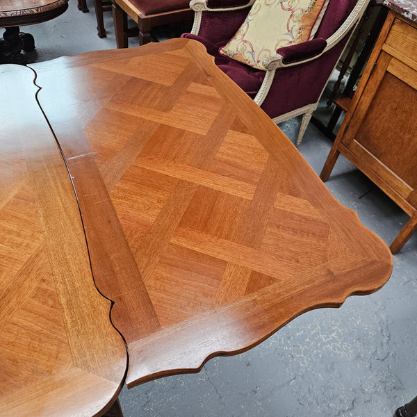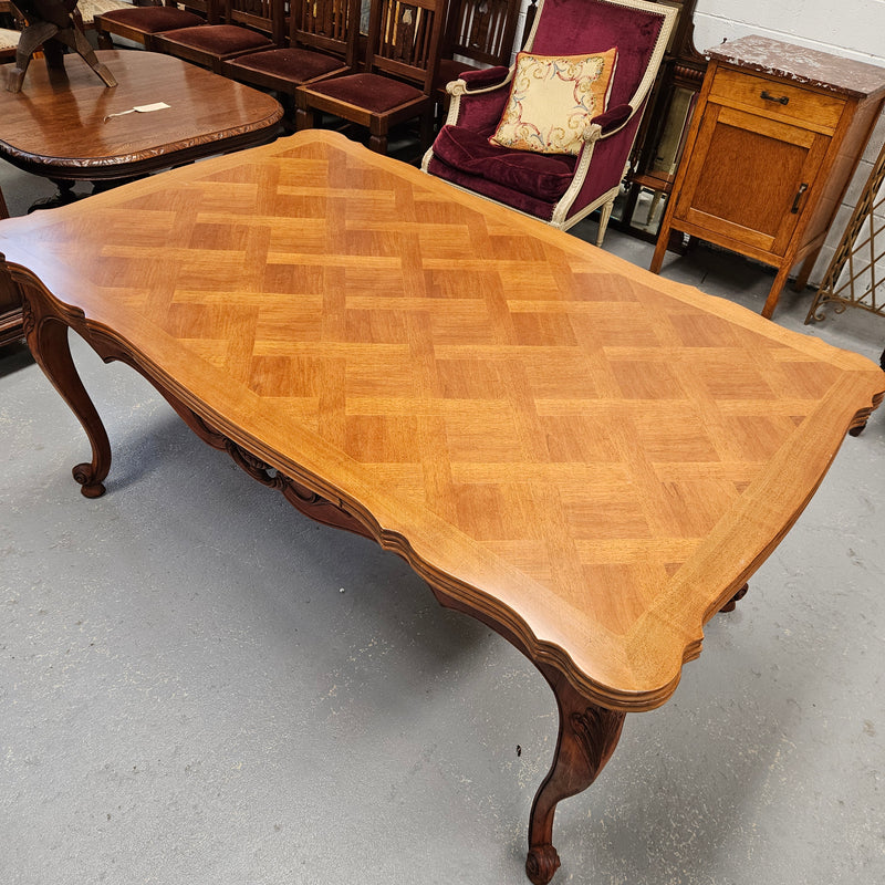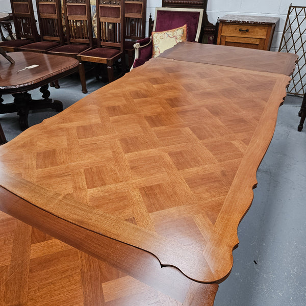Attractive Louis XV style parquetry top French extension dining table. In as found condition, the extentions have some scratches. Please see photos as they form part of the description and condition. When fully extended it is 270 cm long with each extension leaf being 54 cm long.