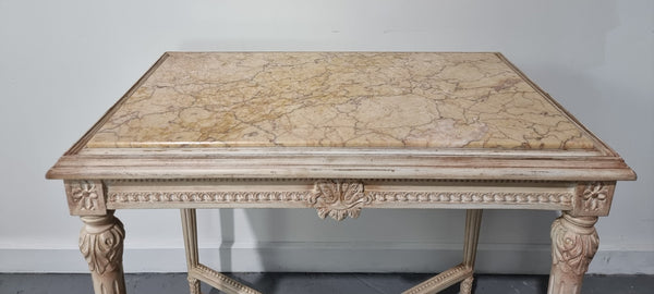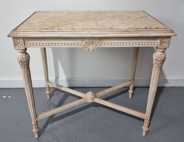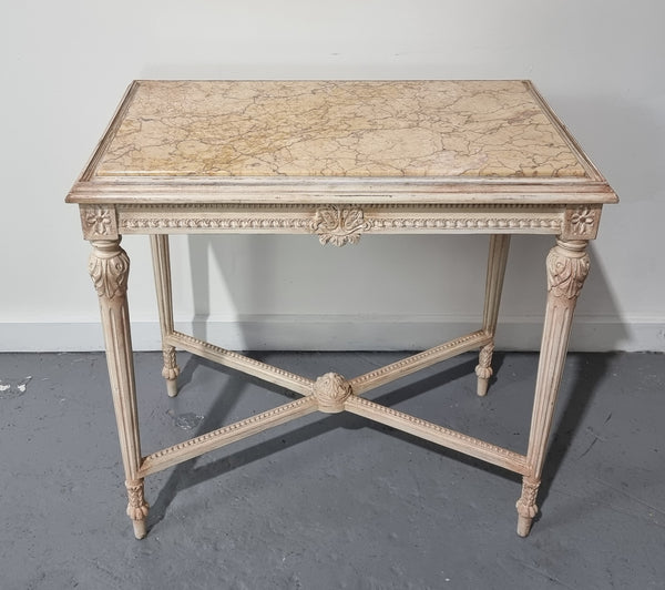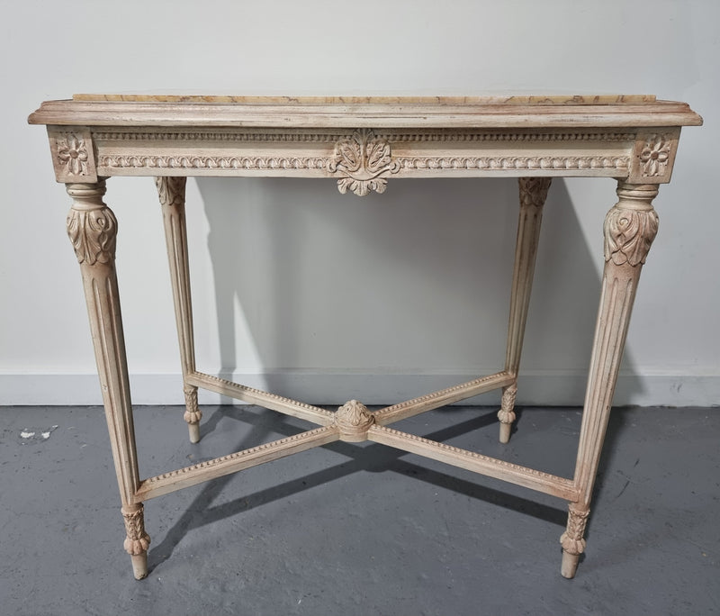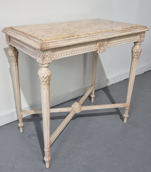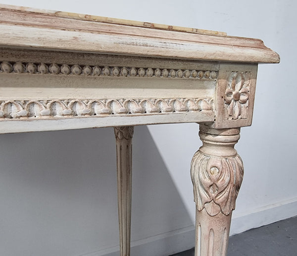 Louis XVI style painted and marble top console table with two drawers either side. This lovely table would also make a great centre table or side table. In good original condition.