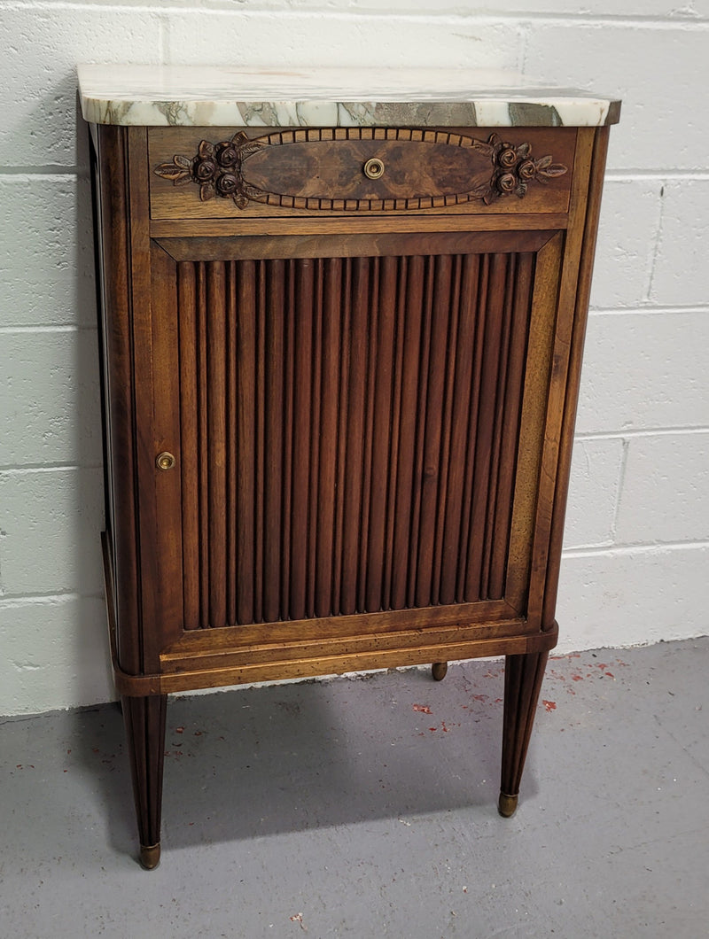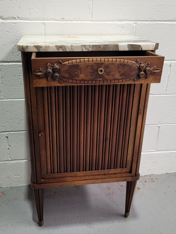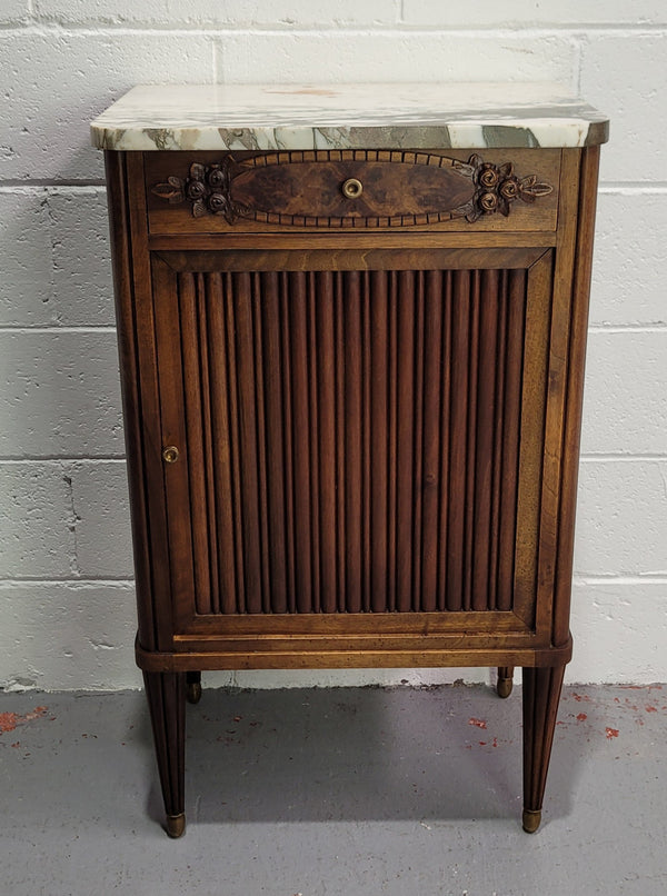 Stunning Louis XVI style Art Deco Walnut side cabinet with amazing coloured marble. It has beautiful carvings and has one drawer and one cupard with a shelf. In good original detailed condition.