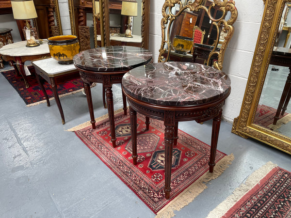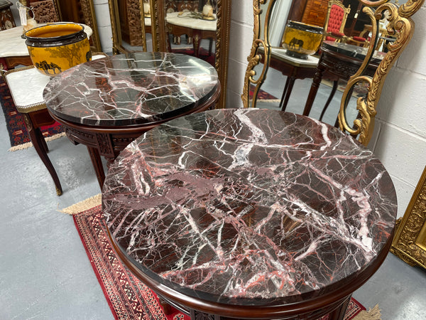 Louis XVl style round marble top coffee \ side table. Beautiful Rosso Levante marble top. Two available. In good condition. Please see photos as they form part of the description and condition.