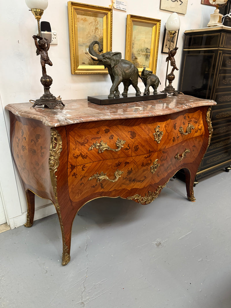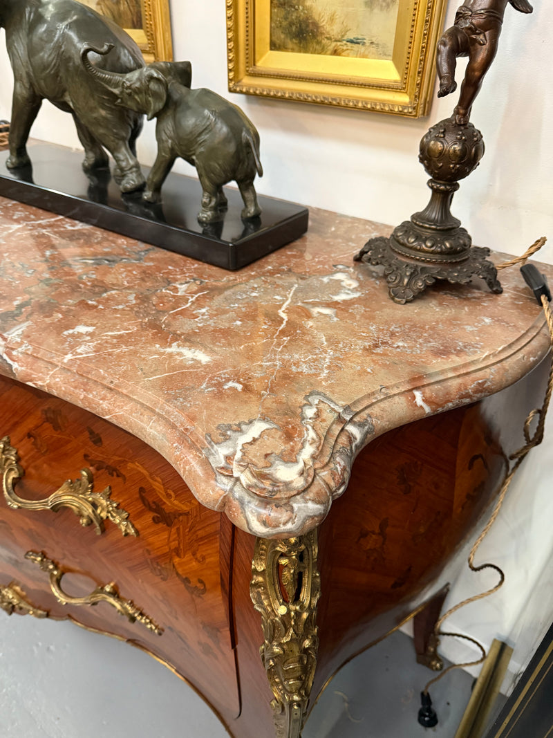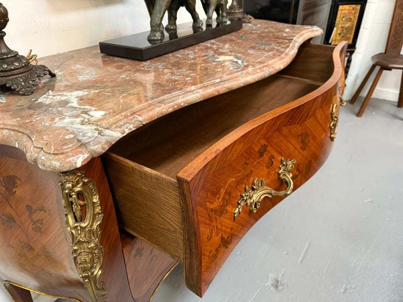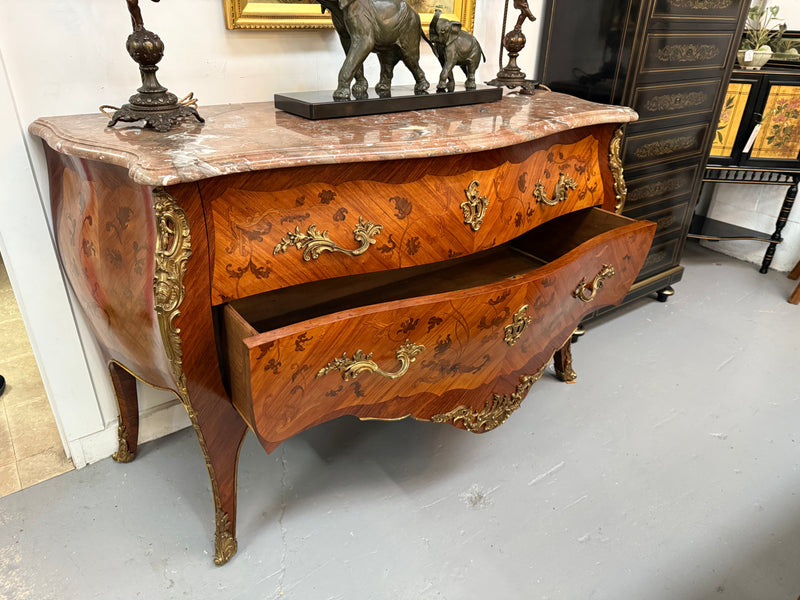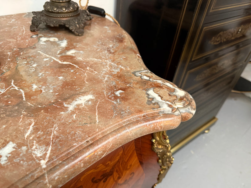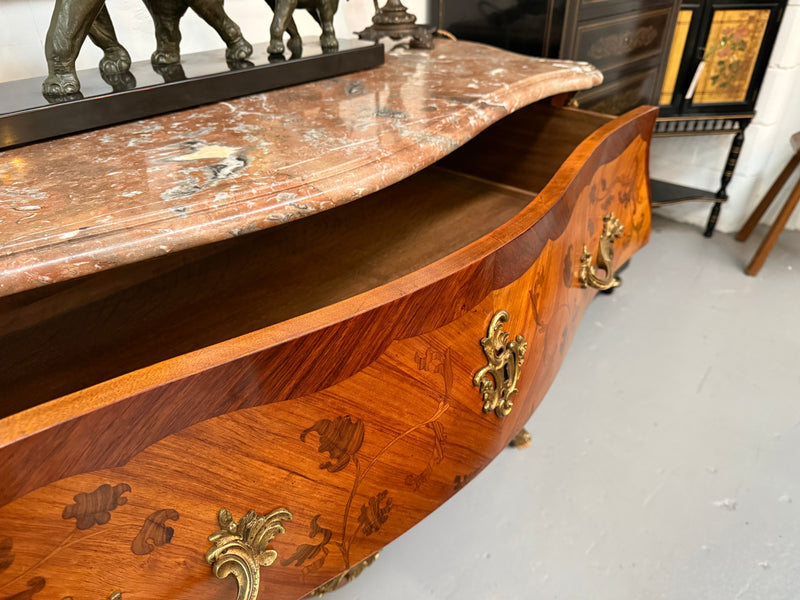 Louis XV Style Marquetry Inlaid Large Marble Topped Commode
