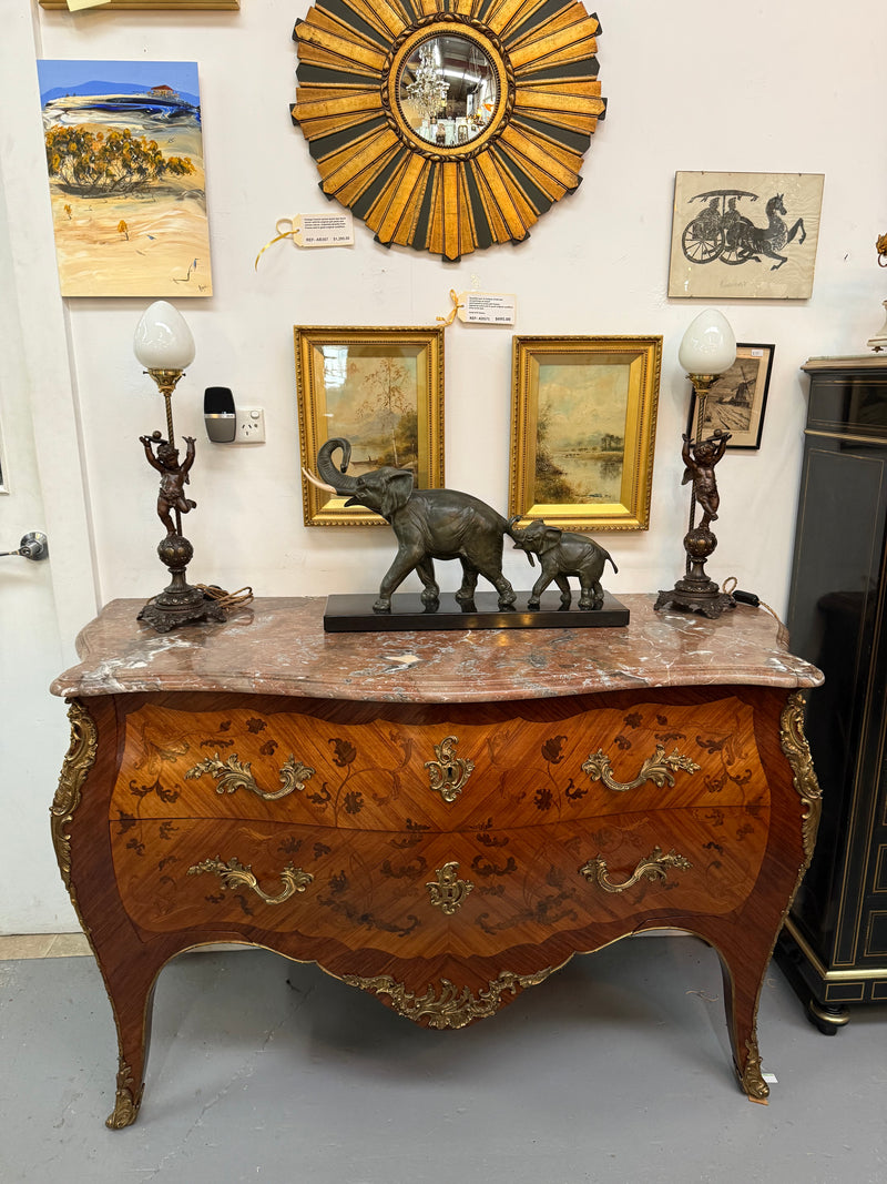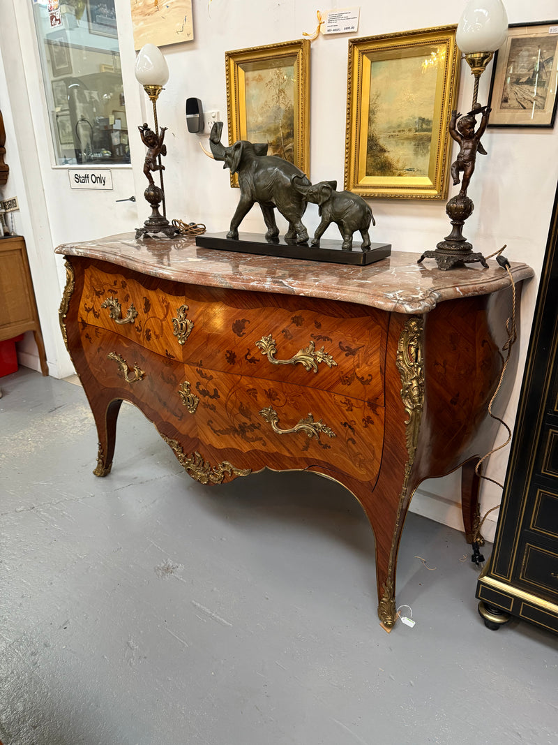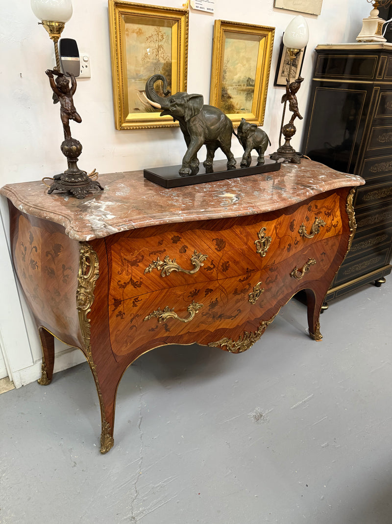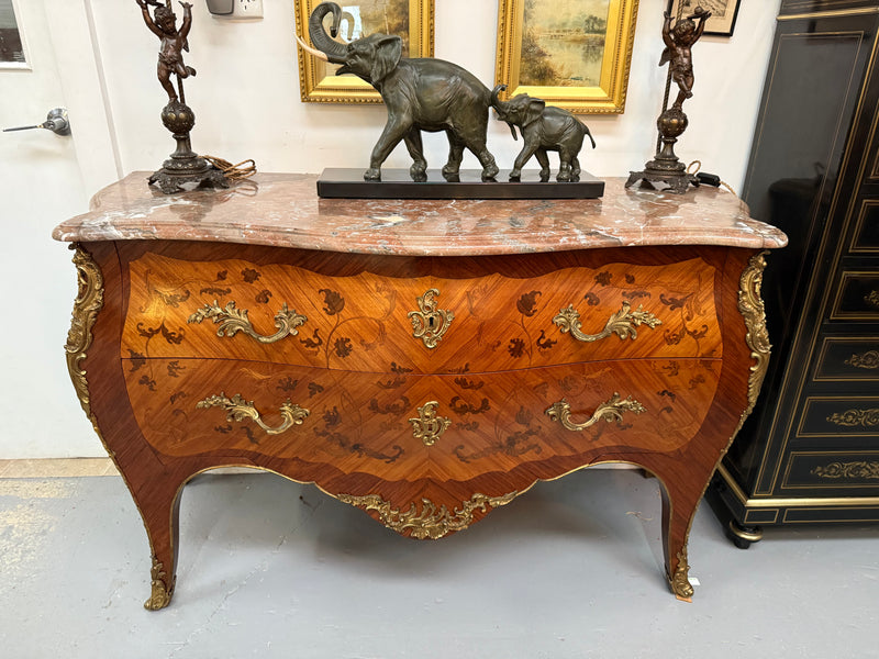 Louis XV Style Marquetry Inlaid Large Marble Topped Commode