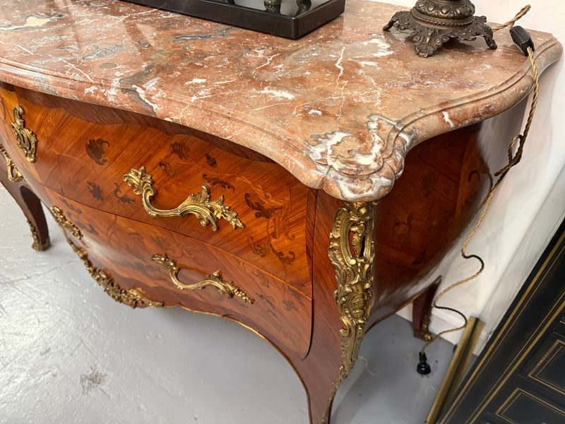 Stunning Louis XV style large two drawer commode. With attractive marquetry inlay and beautiful ormolu handles and trims, bevelled marble top. Circa: 1900. In good original detailed condition. Please see photos as they form part of the description and condition.