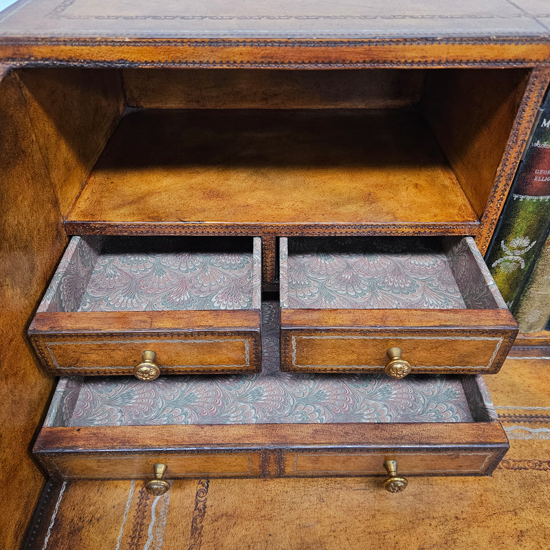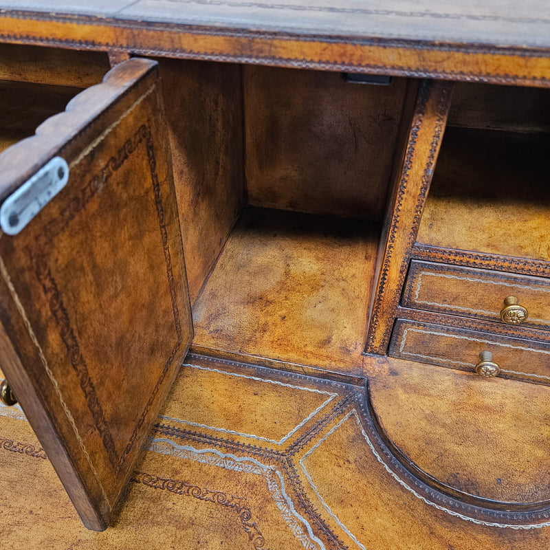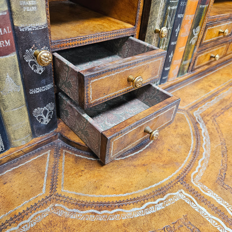 Designed by Maitland Smith in the 1980s.The desk has a tooled leather top with drawers and two small cupboards with the doors being faux books, resting on amgilded accents and wrought iron crossed swords forming the base and gilt metal tassels. It is in amazing original condition.