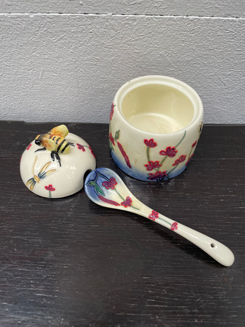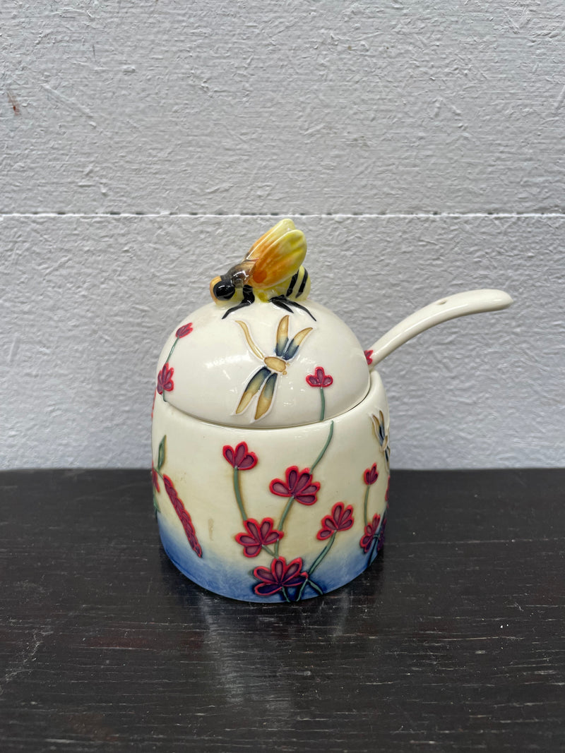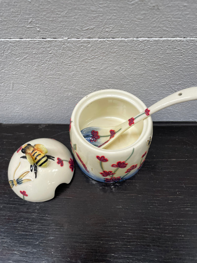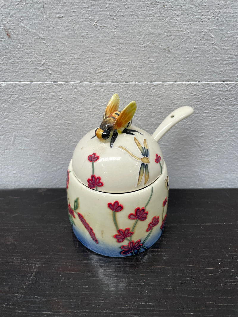 Charming Old Tupton Ware honey pot and spoon. Featuring a bee and dragonflies. In good original condition. Please see photos as they form part of the description.