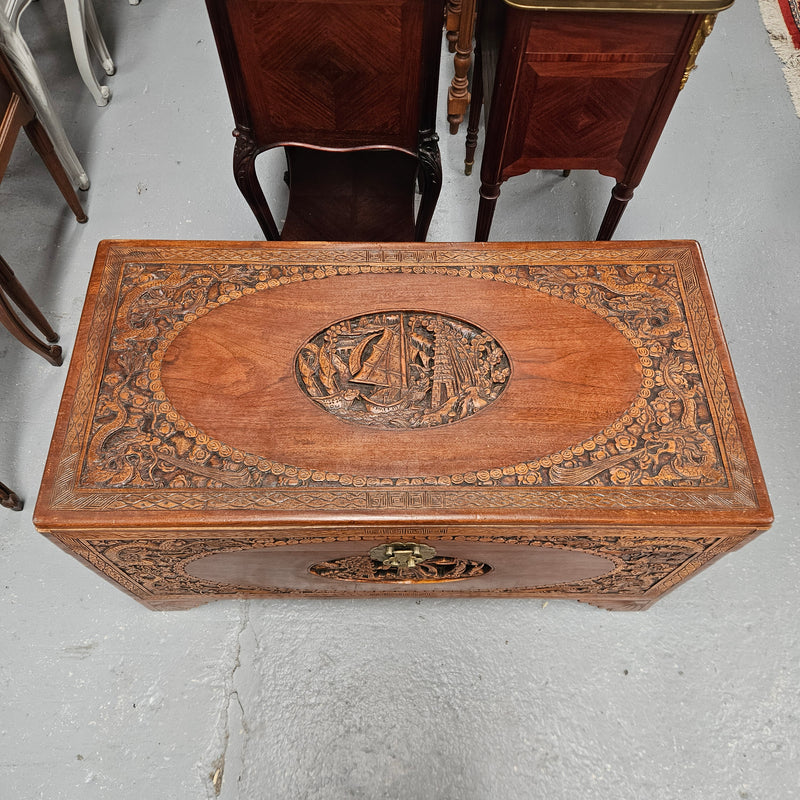 Impressive carved Chinese camphor wood chest with boat carvings on the top and front. It is Circa 1930's. It is in excellent original condition. Please see photos as they form part of the description.