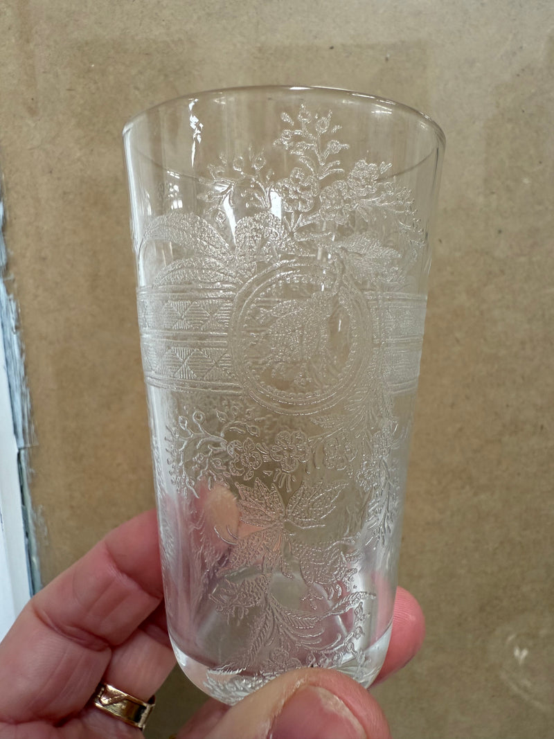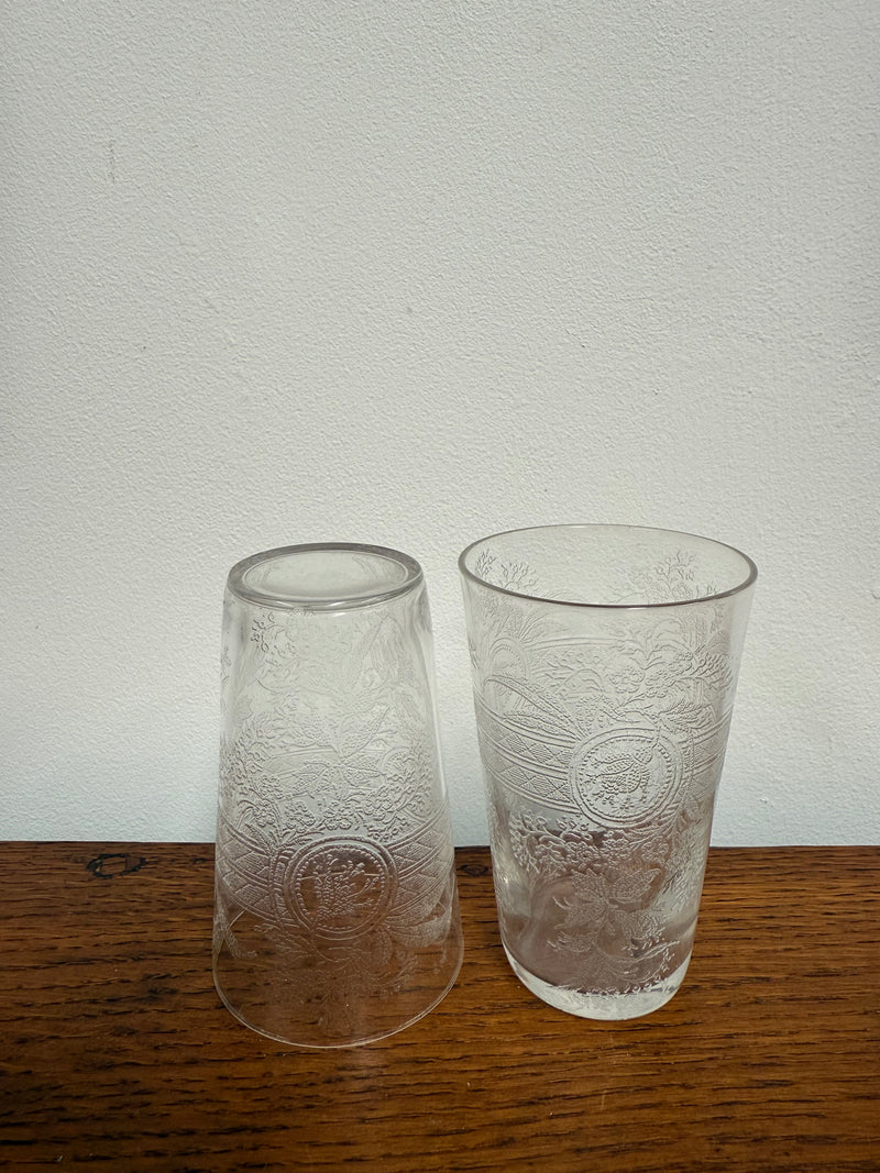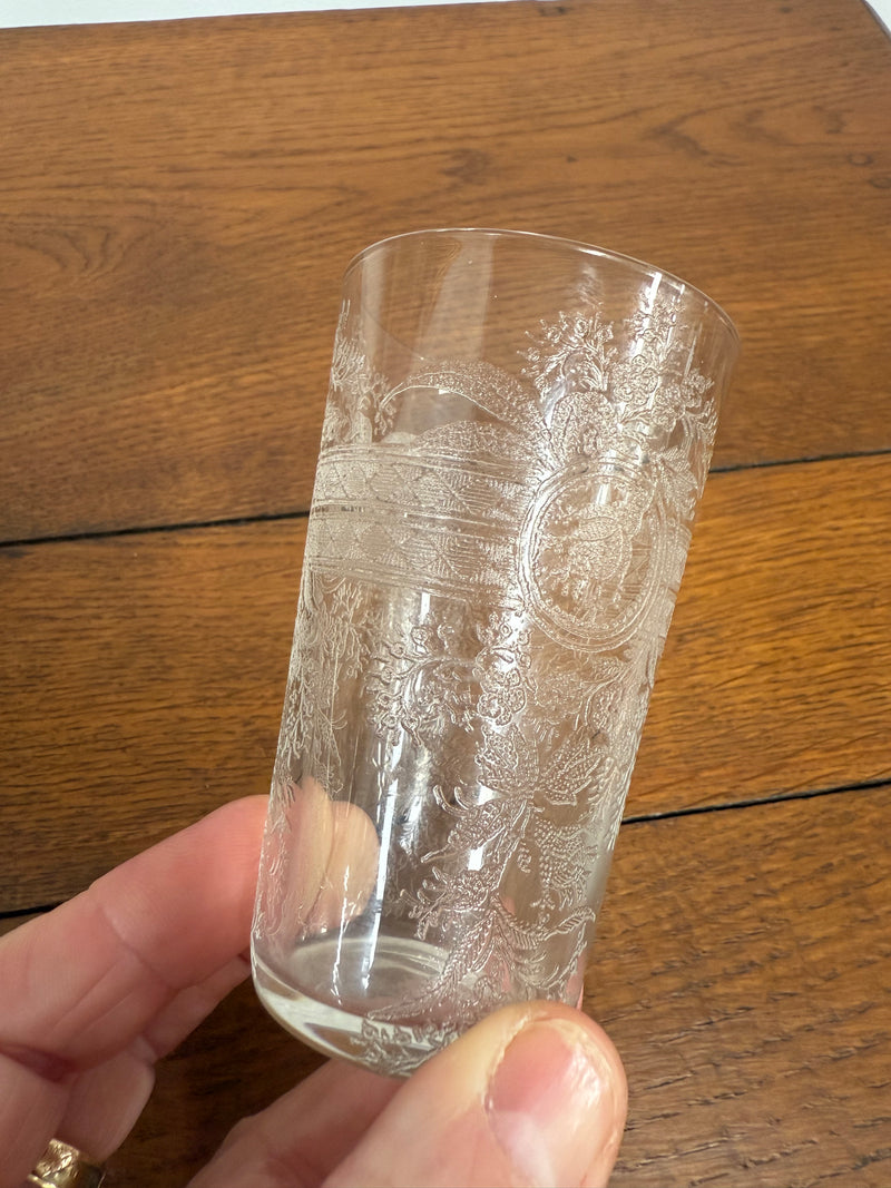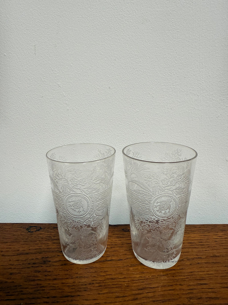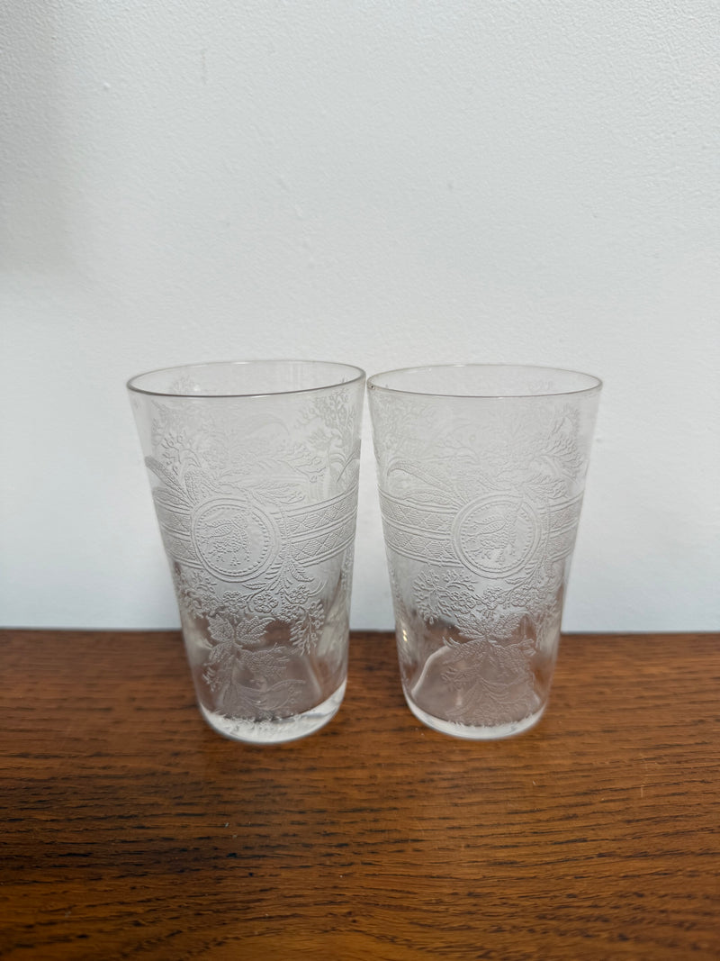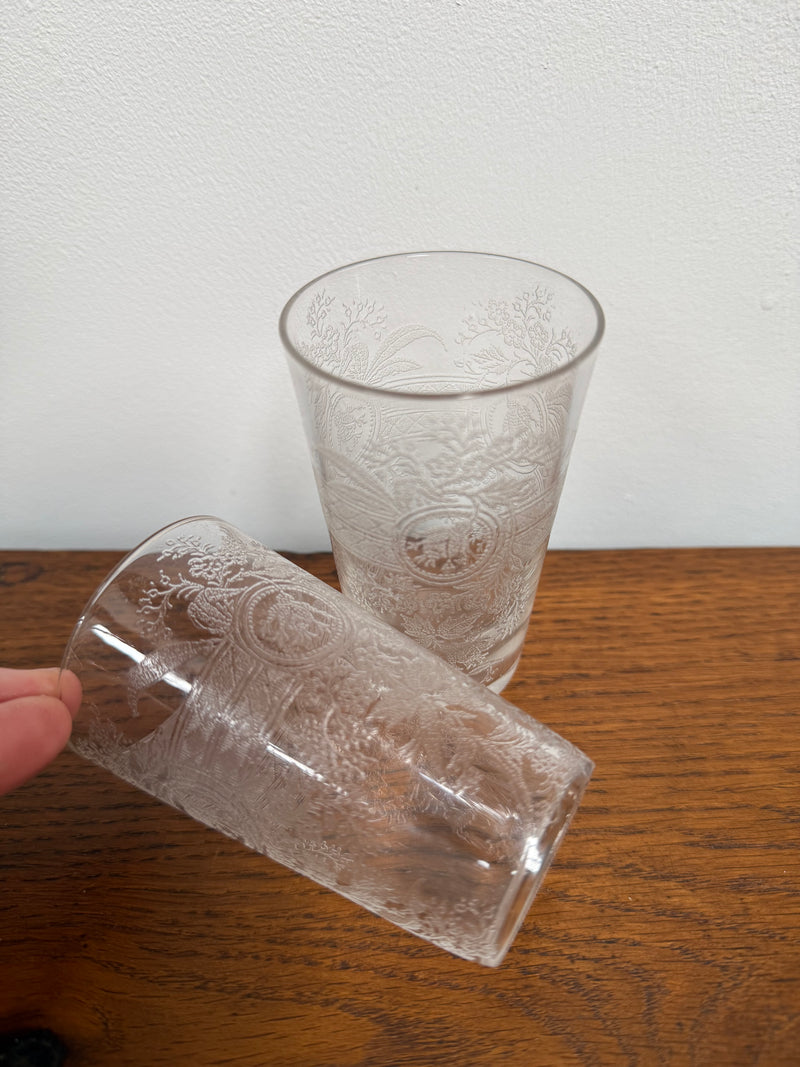 Pair of acid etched Antique drinking glasses. In good original condition. Please see photos as they help form part of the description and condition.