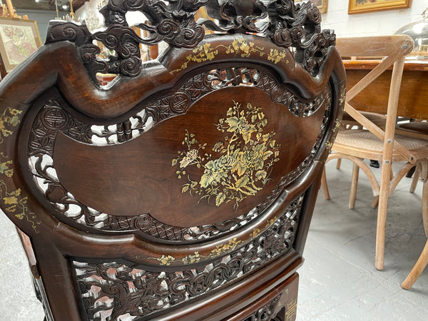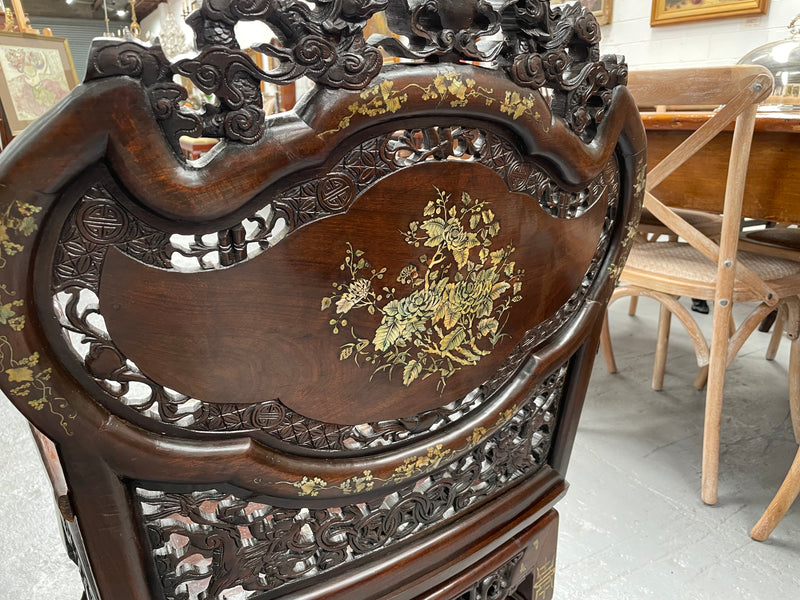 Impressive, intricately carved rosewood oriental armchairs with swirling dragon arms. Featuring mother of pearl inlay and in good original condition. Please see photos as they form part of the description and condition.