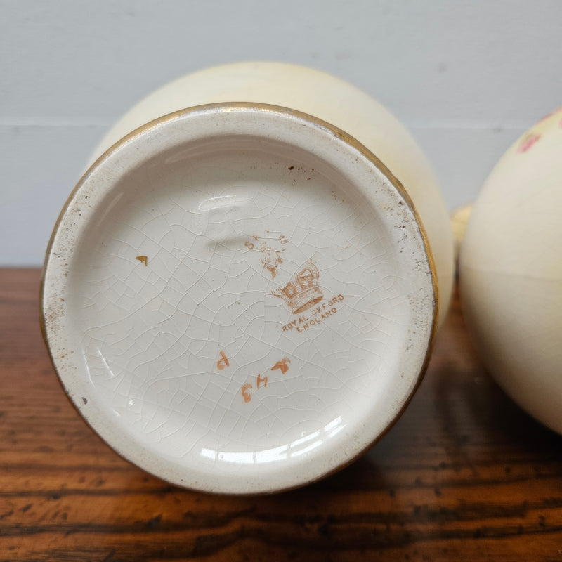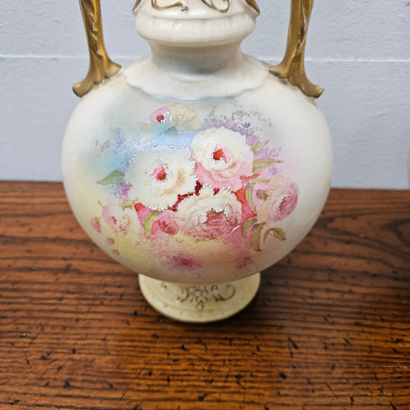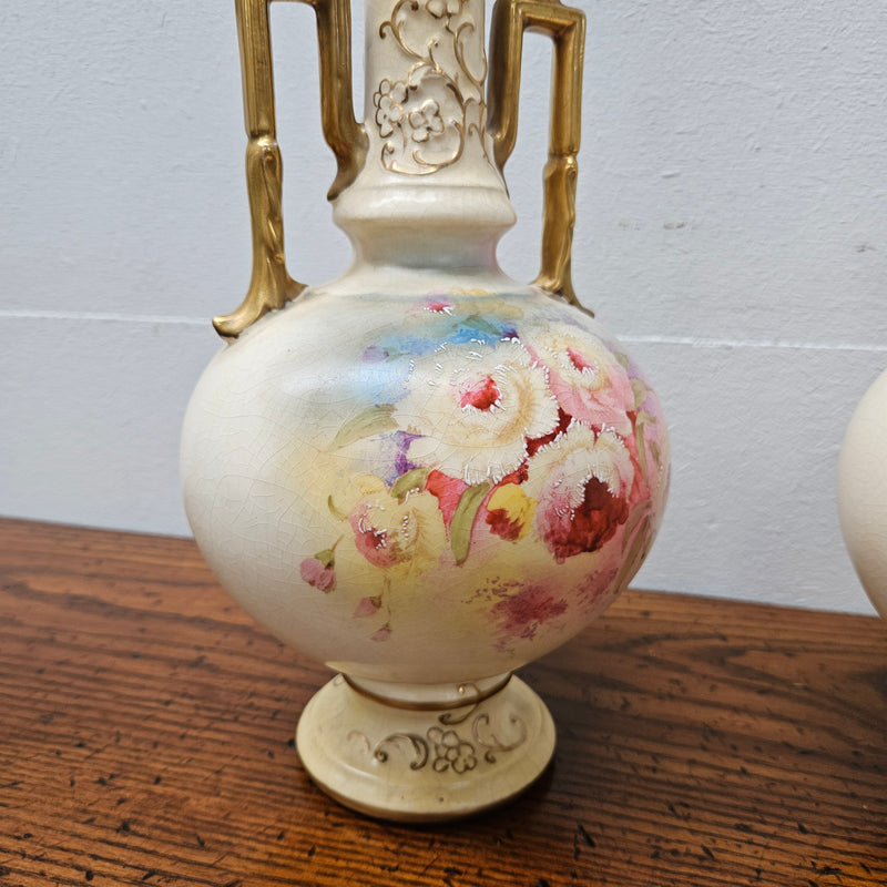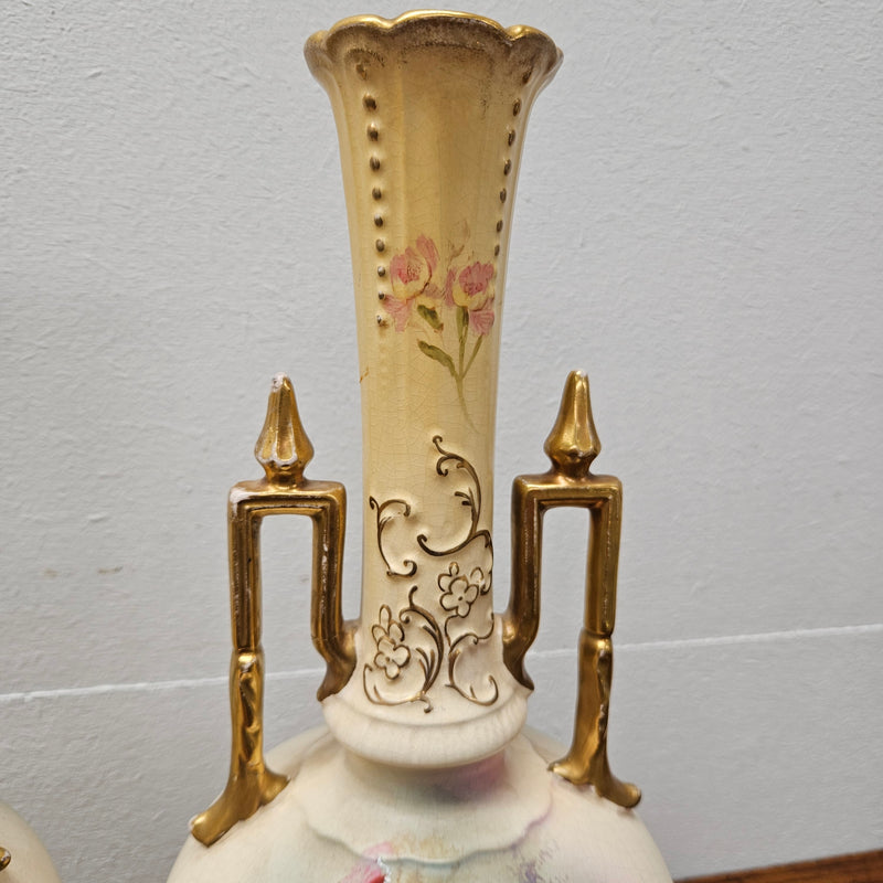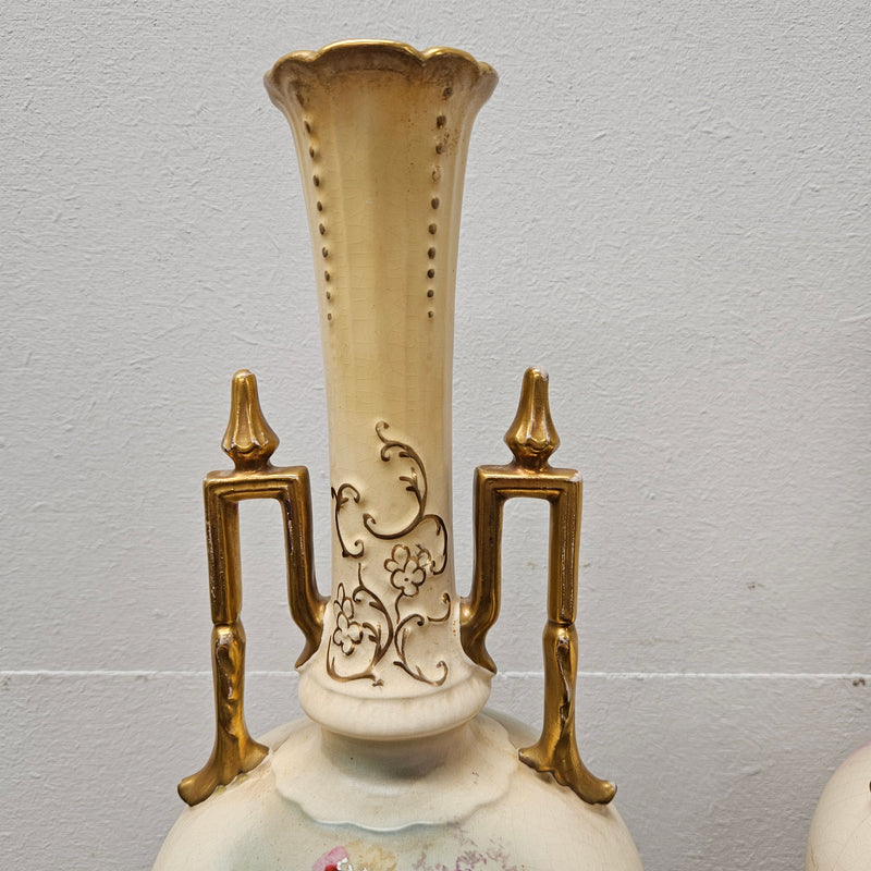 Beautiful hand painted tall necked vases with gold gilt details on the handles and rim around the top. They have some crazing and signs of age, one vase appears to have a repair to the handle as pictured. Please see photos as they form part of the description.