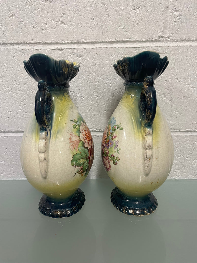 Lovely pair of decorated floral vases with two handles each. These vases are I'm good original condition. Please view photos as they form part of the description.