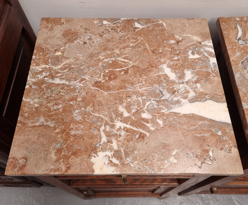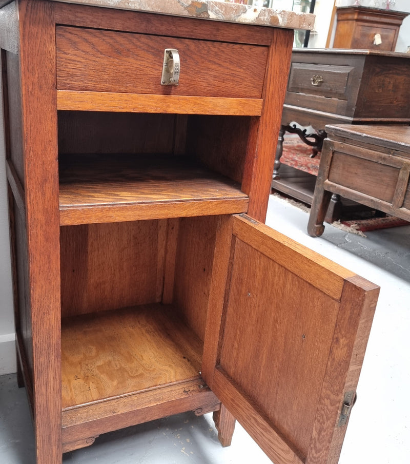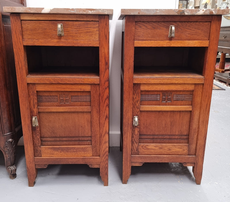 Pair of French Oak Arts & Crafts Marble Top Bedsides. Featuring a drawer, shelf and cupboard. Circ: 1910 Please view photos as they help form part of the description. In good original detailed condition.