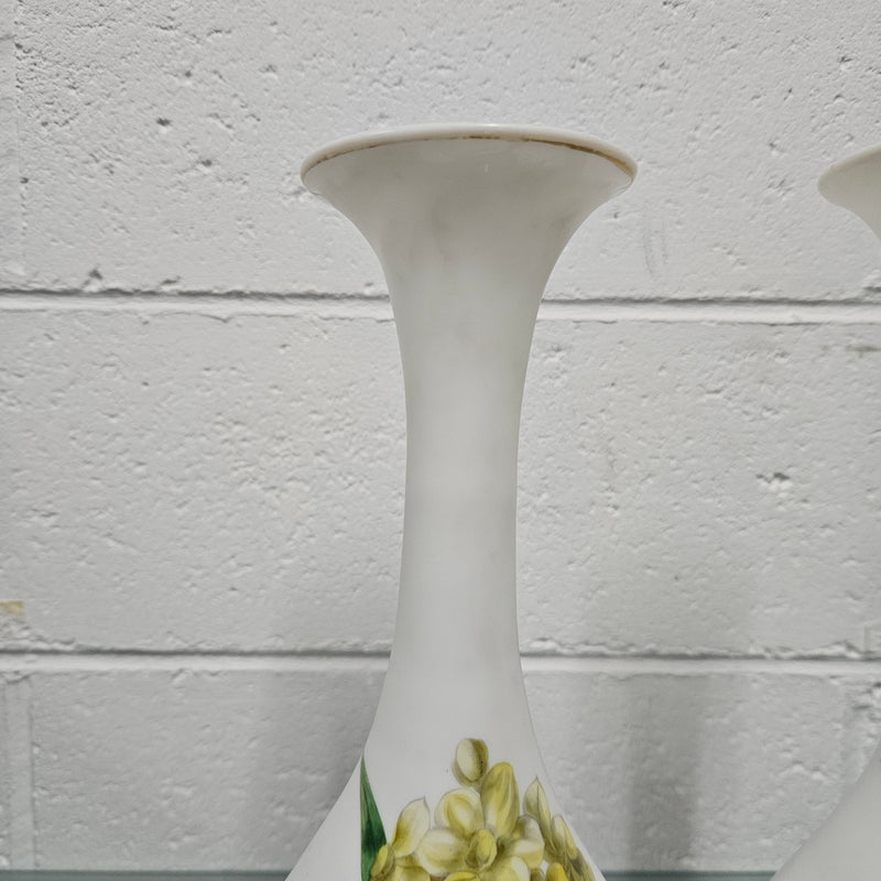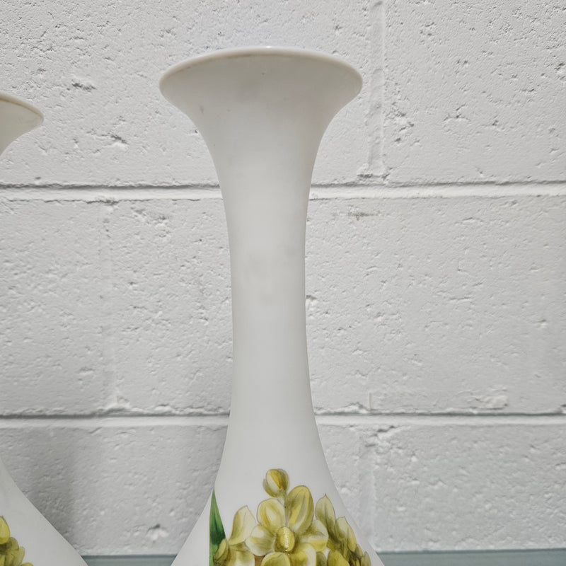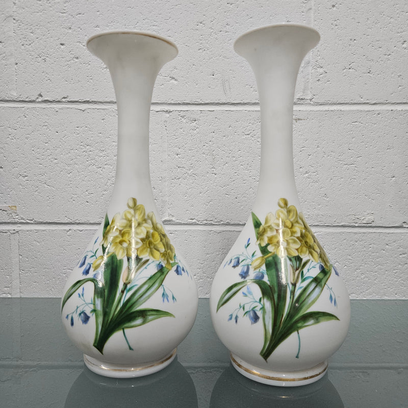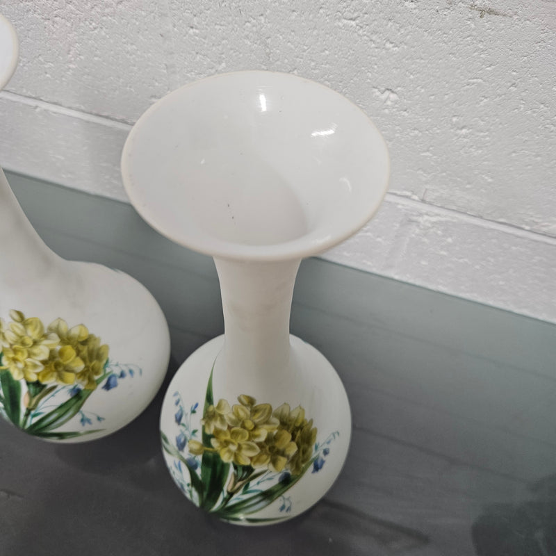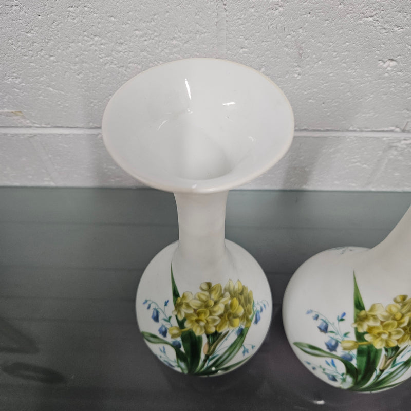 Pair Of Hand Painted Antique Milk Glass Vases Featuring Daffodils