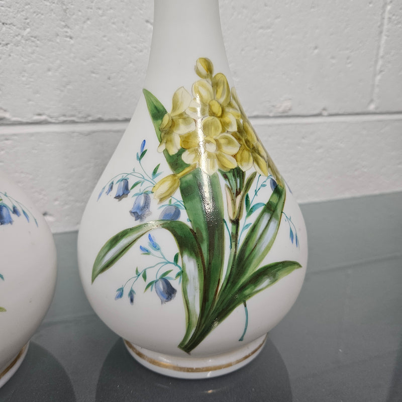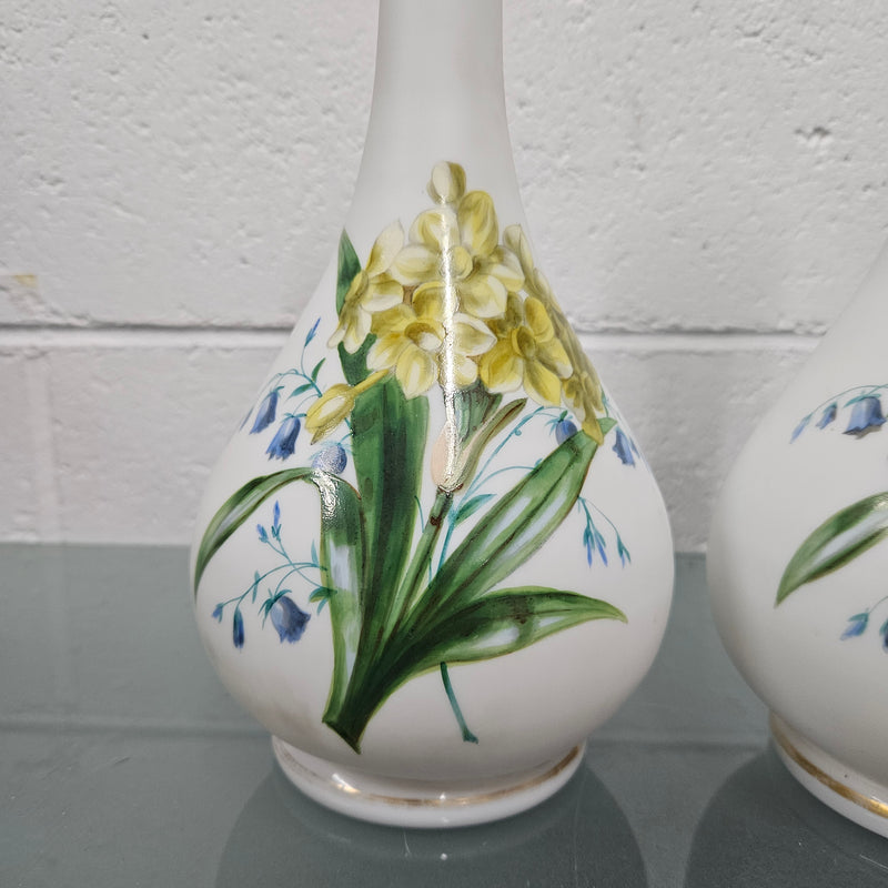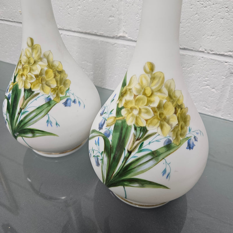 Charming pair of hand painted antique mild glass vases featuring daffodils. In good original condition. Please see photos as they form part of the description.