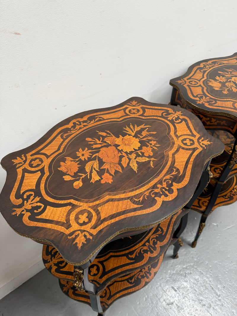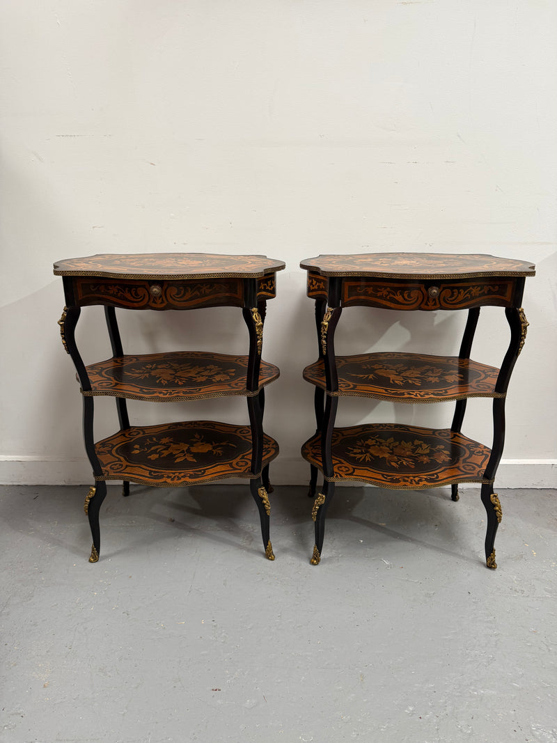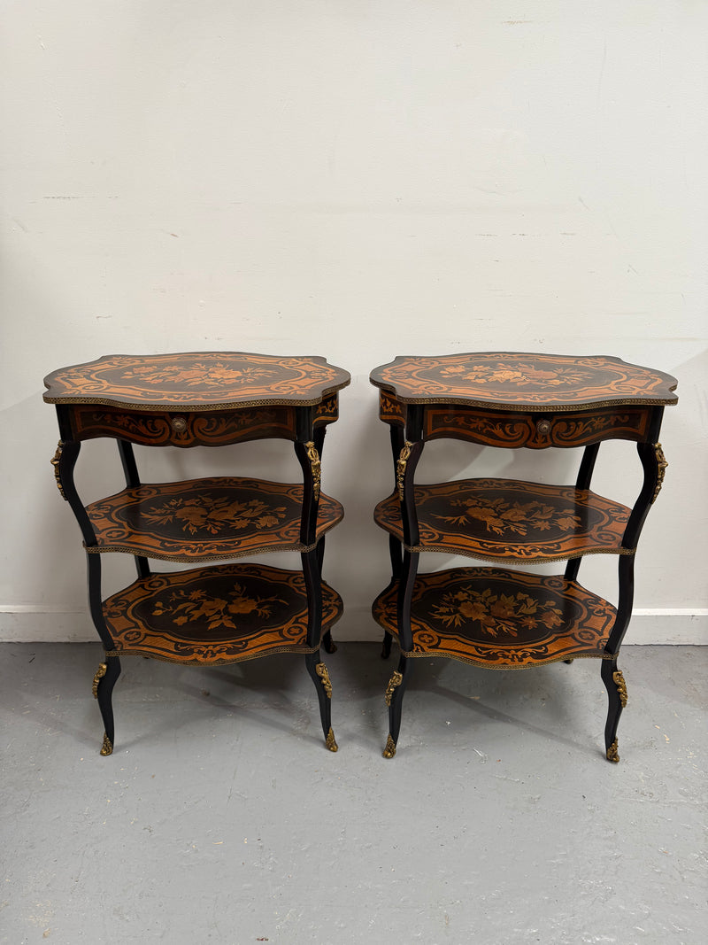 Rare pair of late 19th century ebonised and marquetry three tier etagere of serpentine outline, brass gallery tops and small frieze drawer. They are in good original condition. Please view photos as they help to form part of the description and condition.