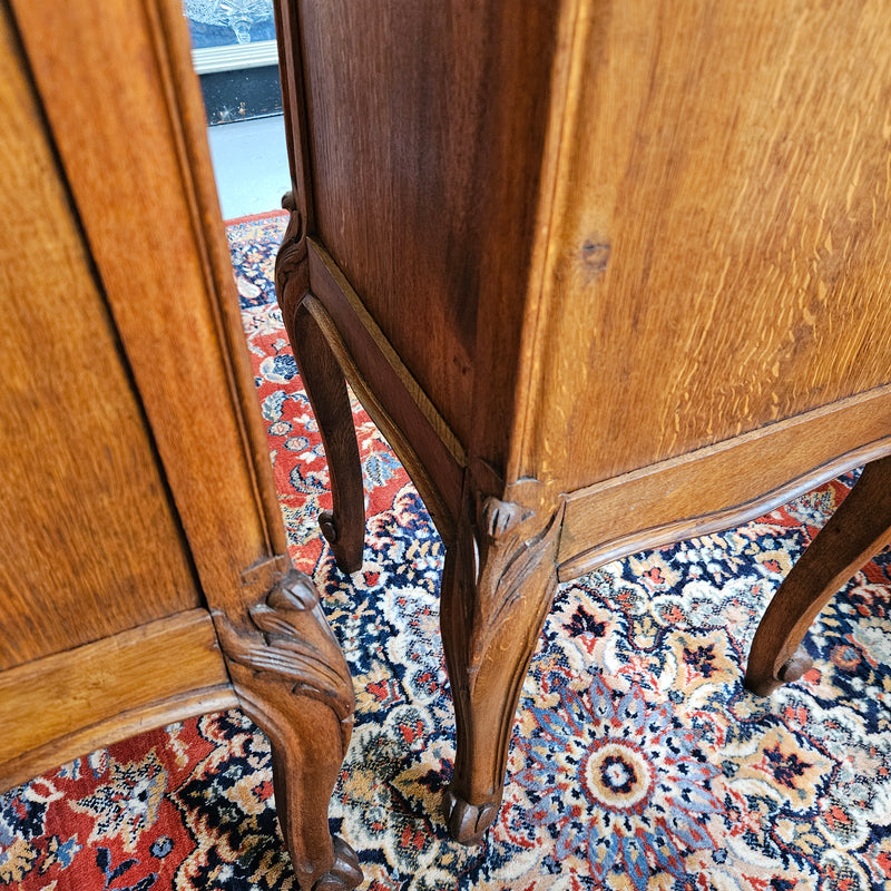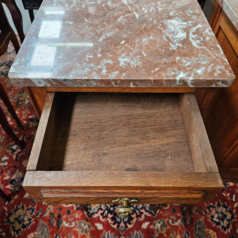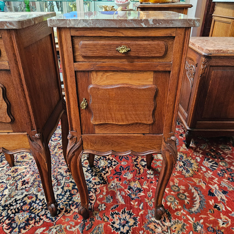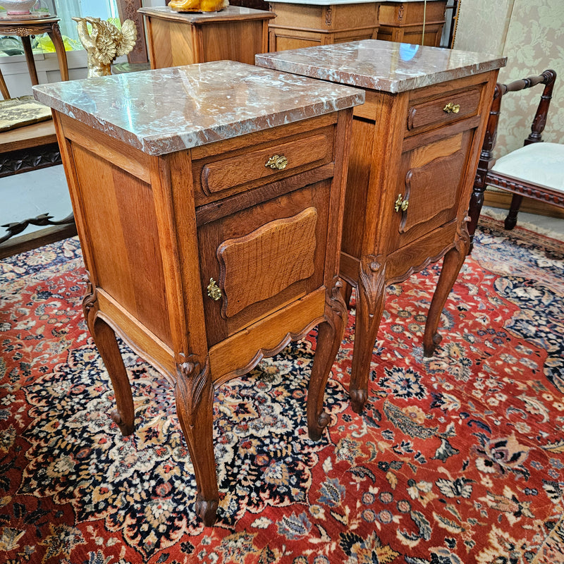 Pair of French oak marble top bedsides in Louis XV style with one drawer and cupboard. They are in good condition. Please see photos as they form part of the description and condition