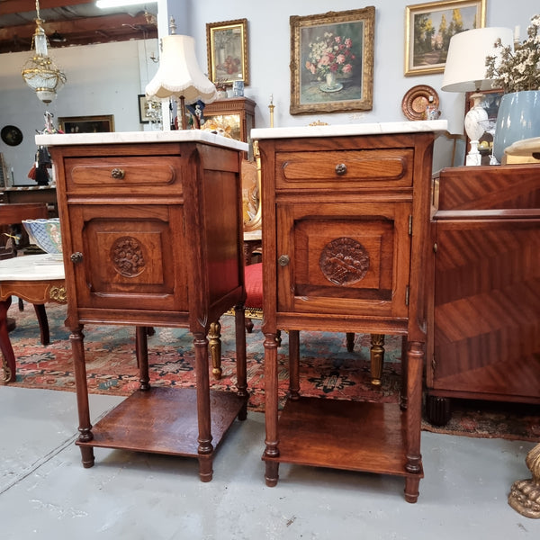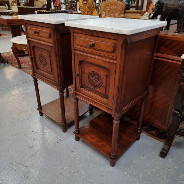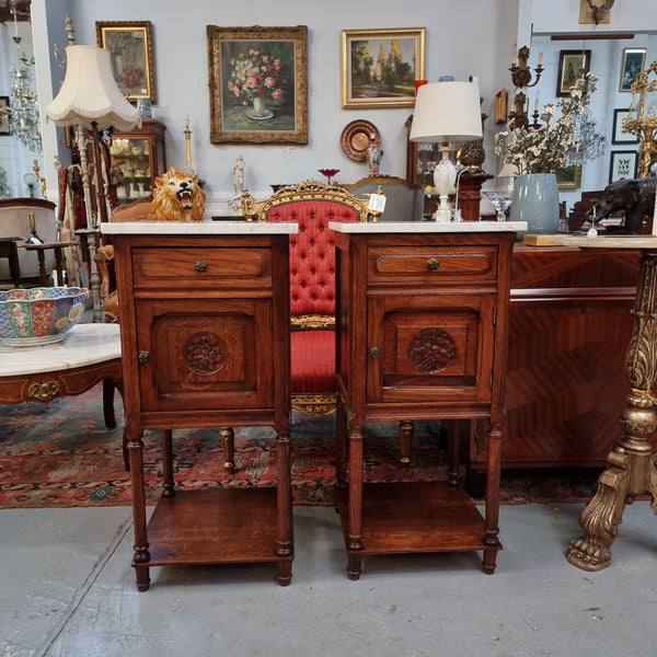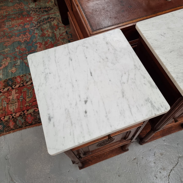 Pair of French Oak Henry II style oak white marble top bedside cabinets featuring decorative carvings, one drawer, one cupboard and a lower shelf. These bedsides are in good original detailed condition. Please see photos as they form part of the description and condition.