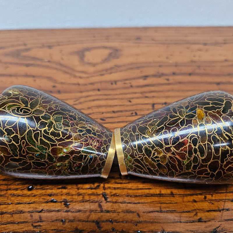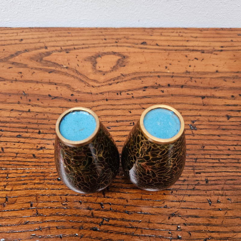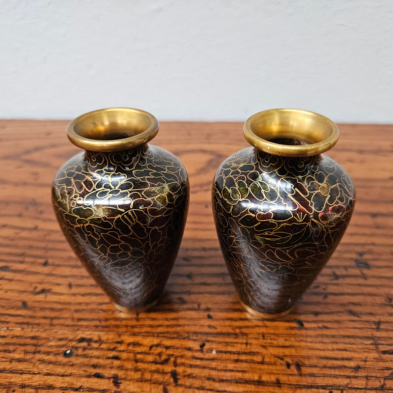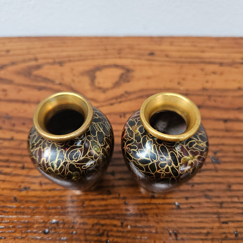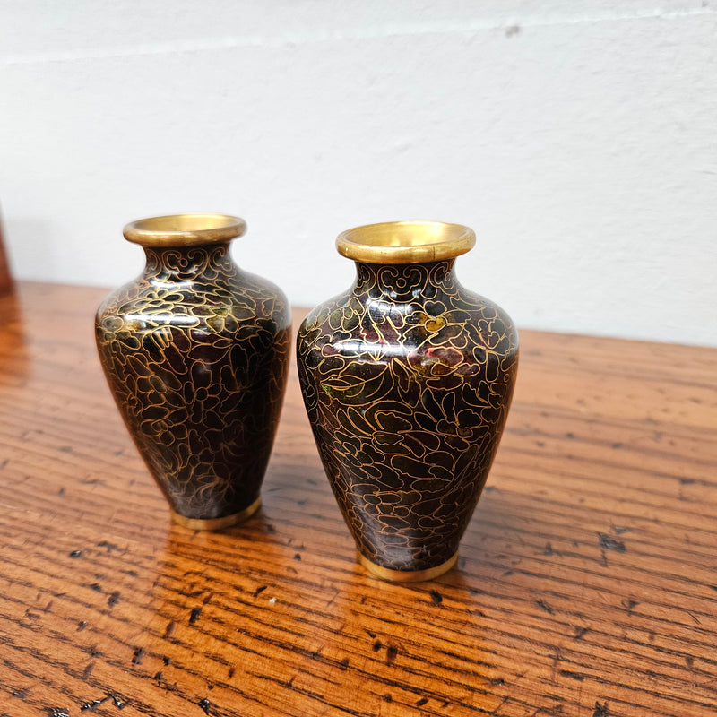 Stunning miniature pair of Cloisonne vases with a floral and gold detail design. It is in good original condition. Please see photos as they form part of the description.