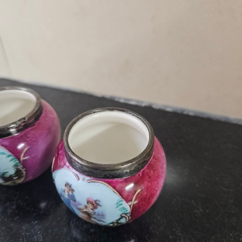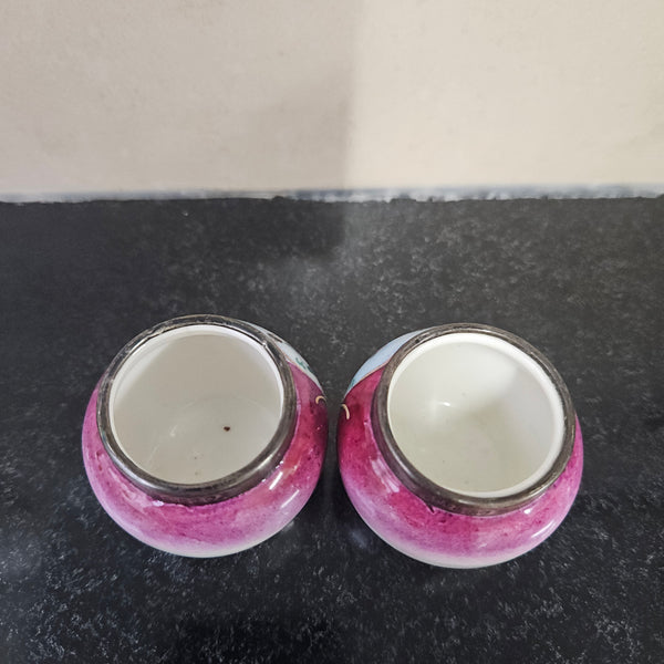 Lovely pair of small silver topped salts, they are in good original condition for the age, there is a hairline crack that does not affect the overall structure. Please see photos as they form part of the description