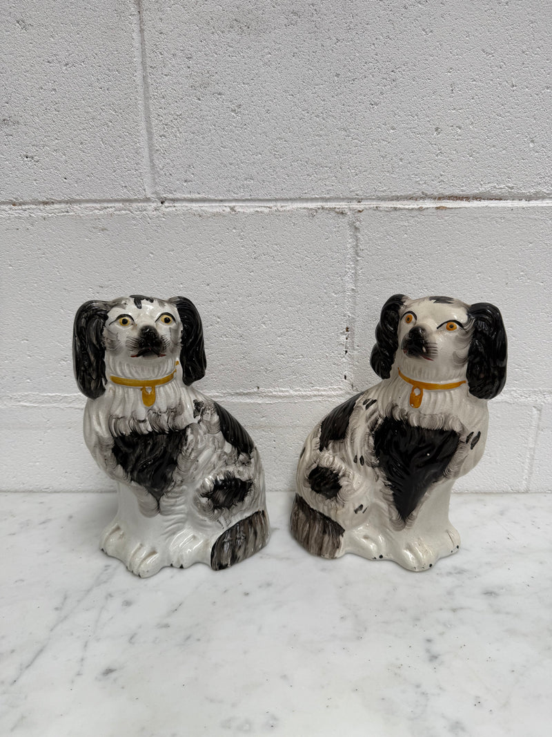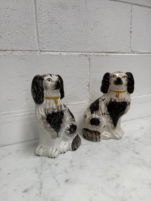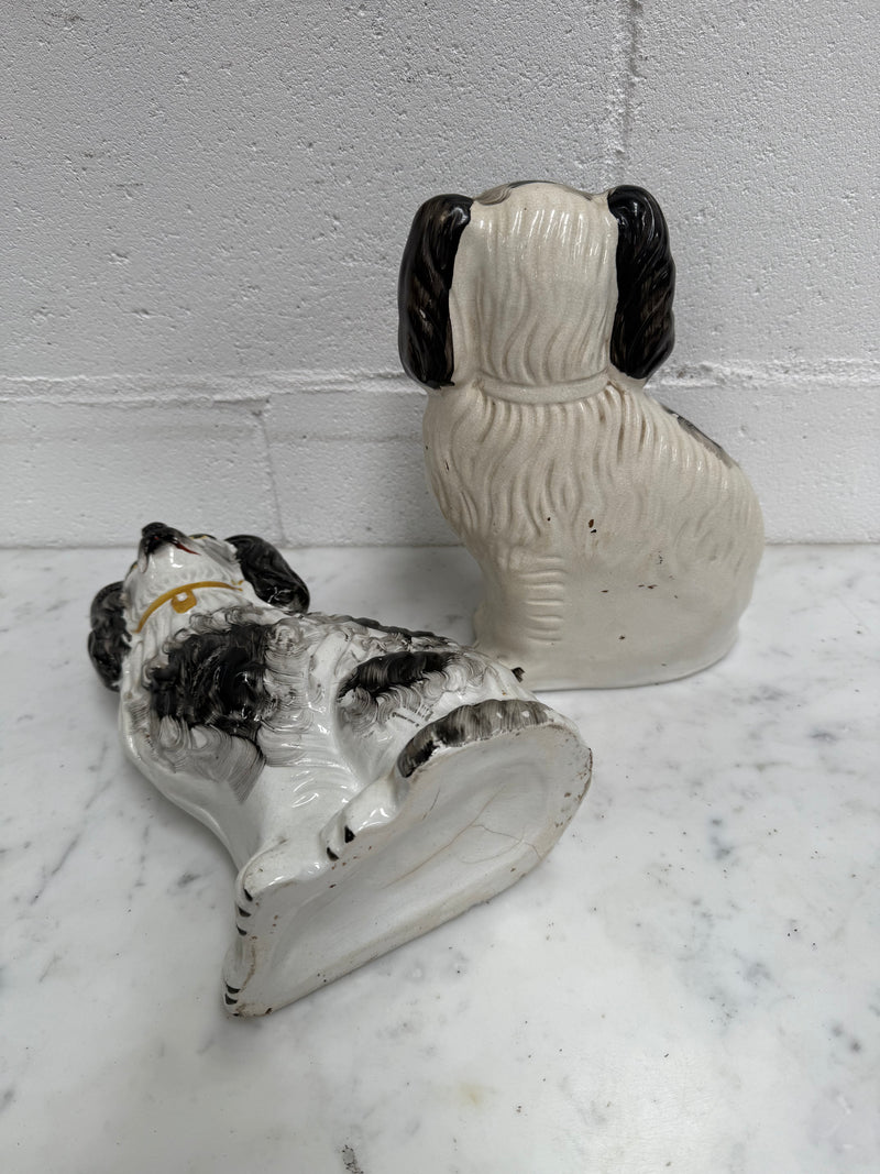 Lovely pair of Victorian mantle spaniels, earthenware black and white decoration. It is in good original condition with some signs of age. Please see photos as they form part of the description.