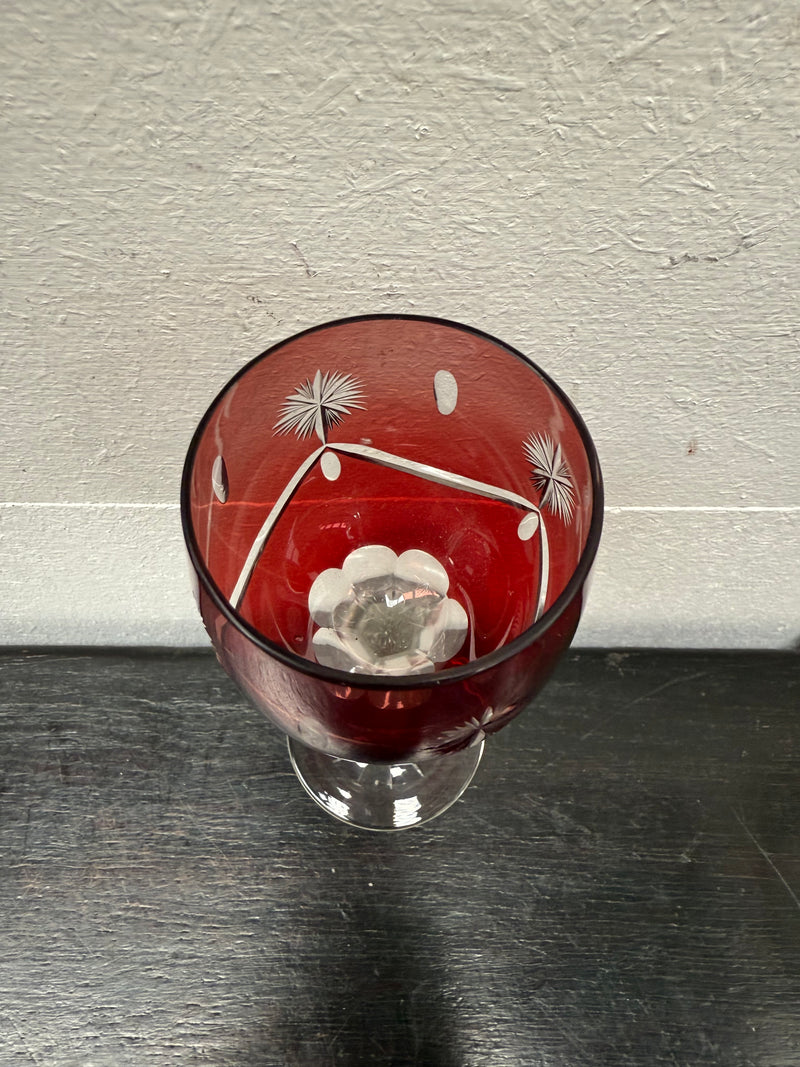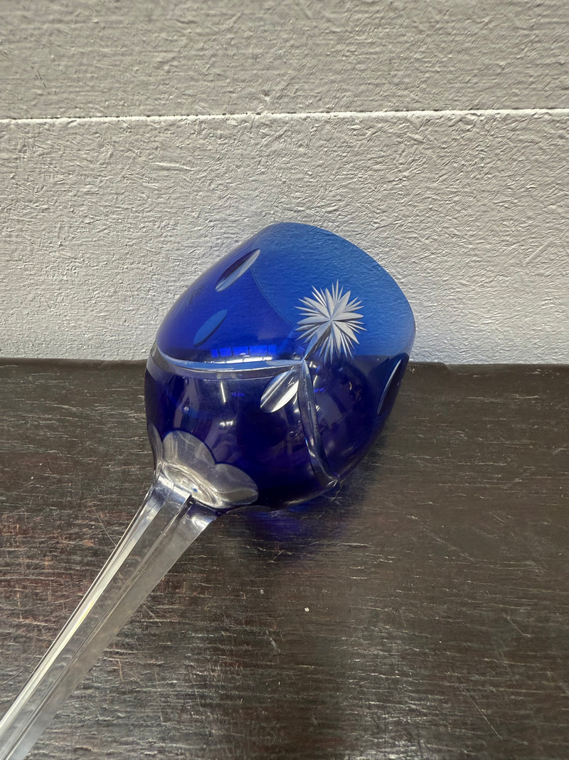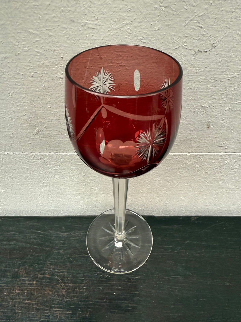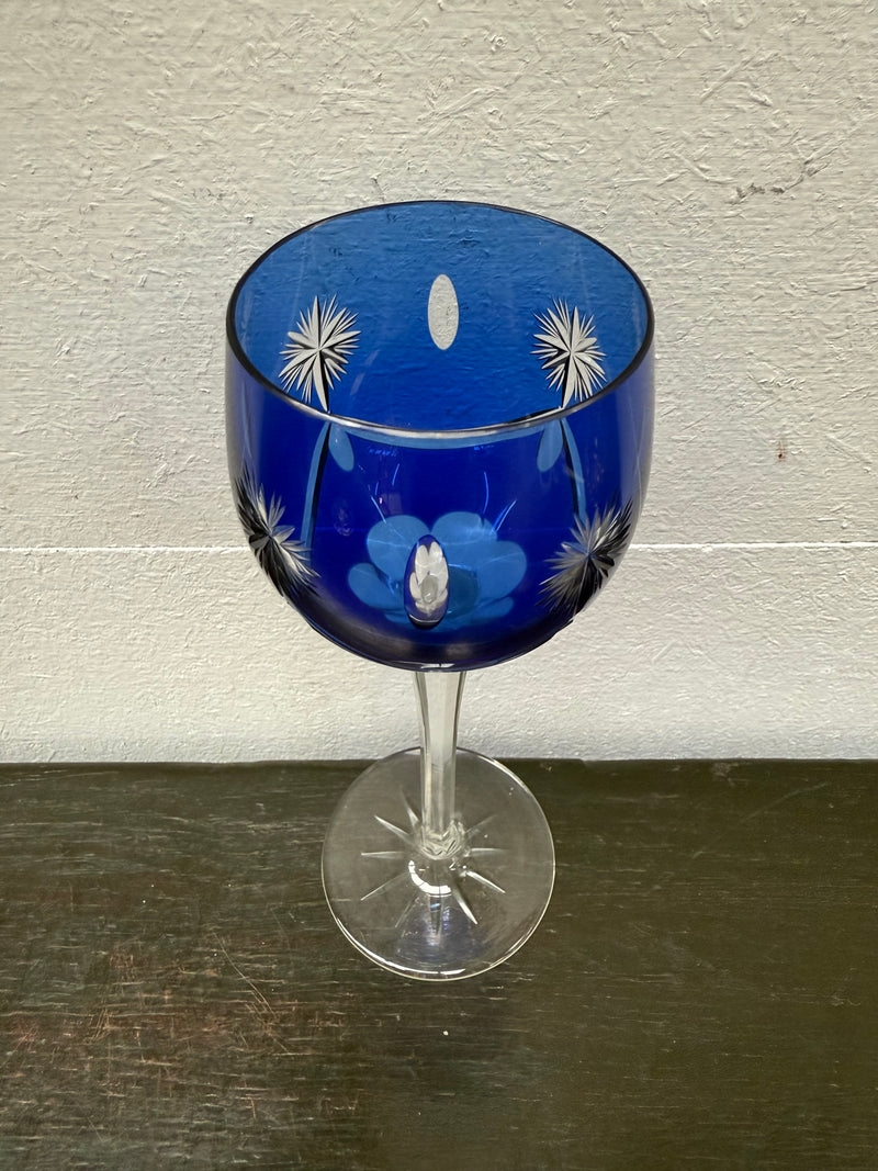 Pair of vintage Bohemian cobalt and ruby coloured cut glass wine glasses. In good original condition. Please see photos as they form part of the description.