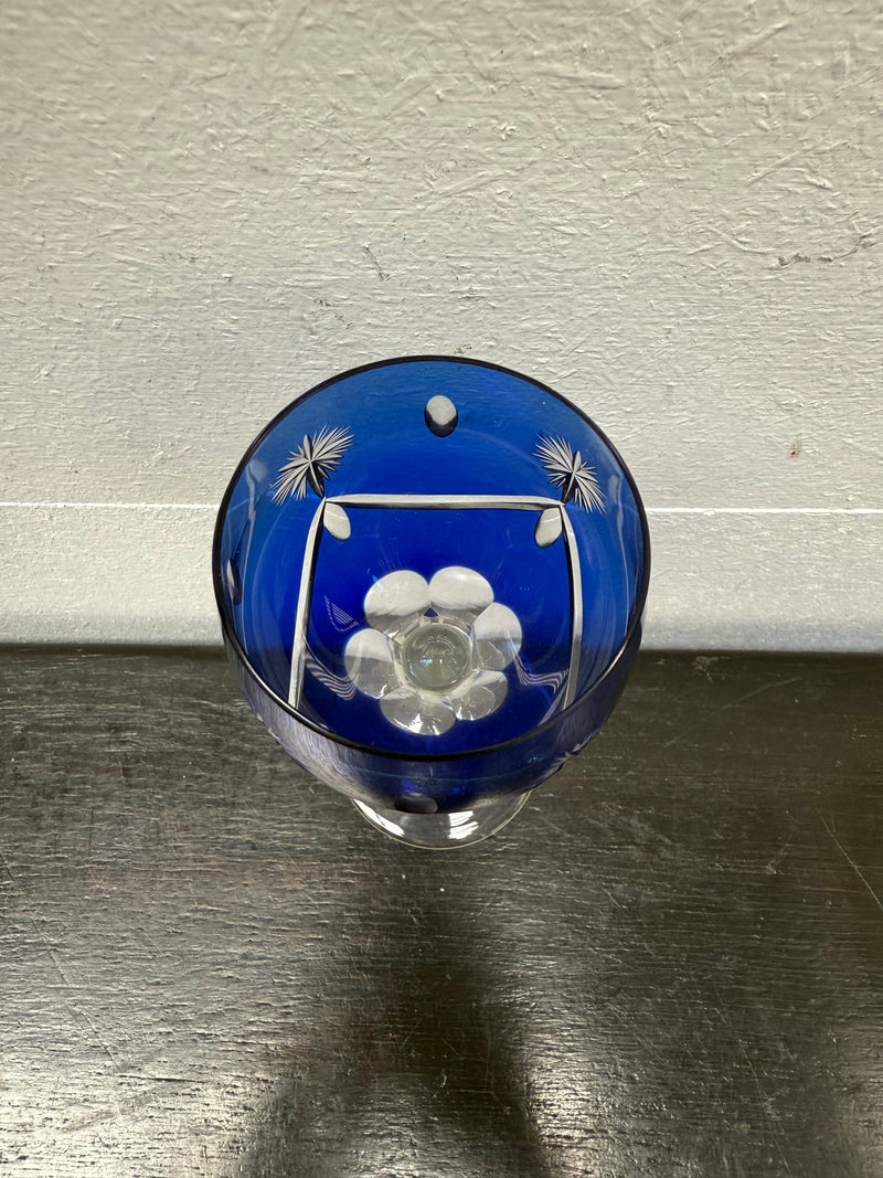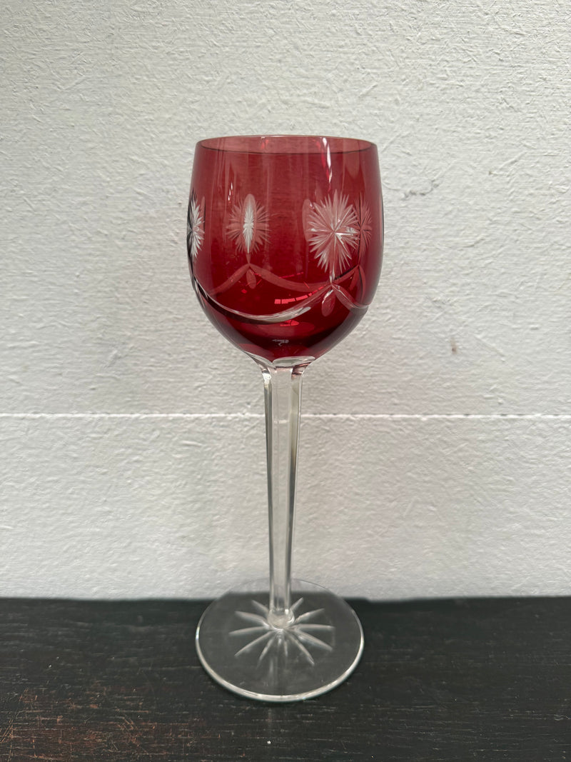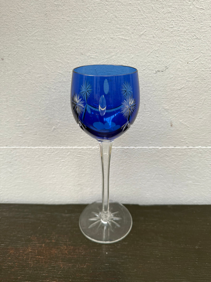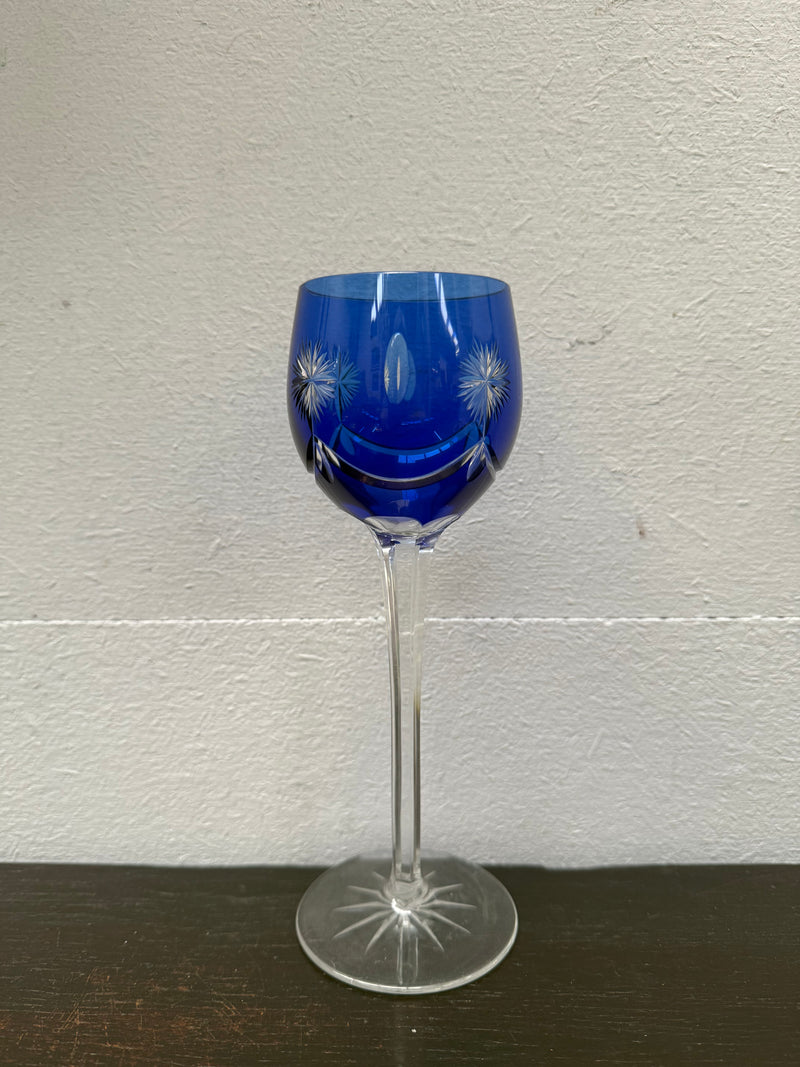 Pair of vintage Bohemian cobalt and ruby coloured cut glass wine glasses. In good original condition. Please see photos as they form part of the description.