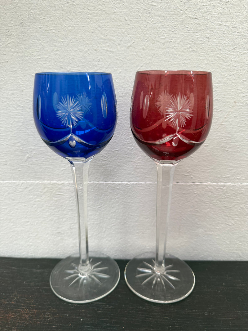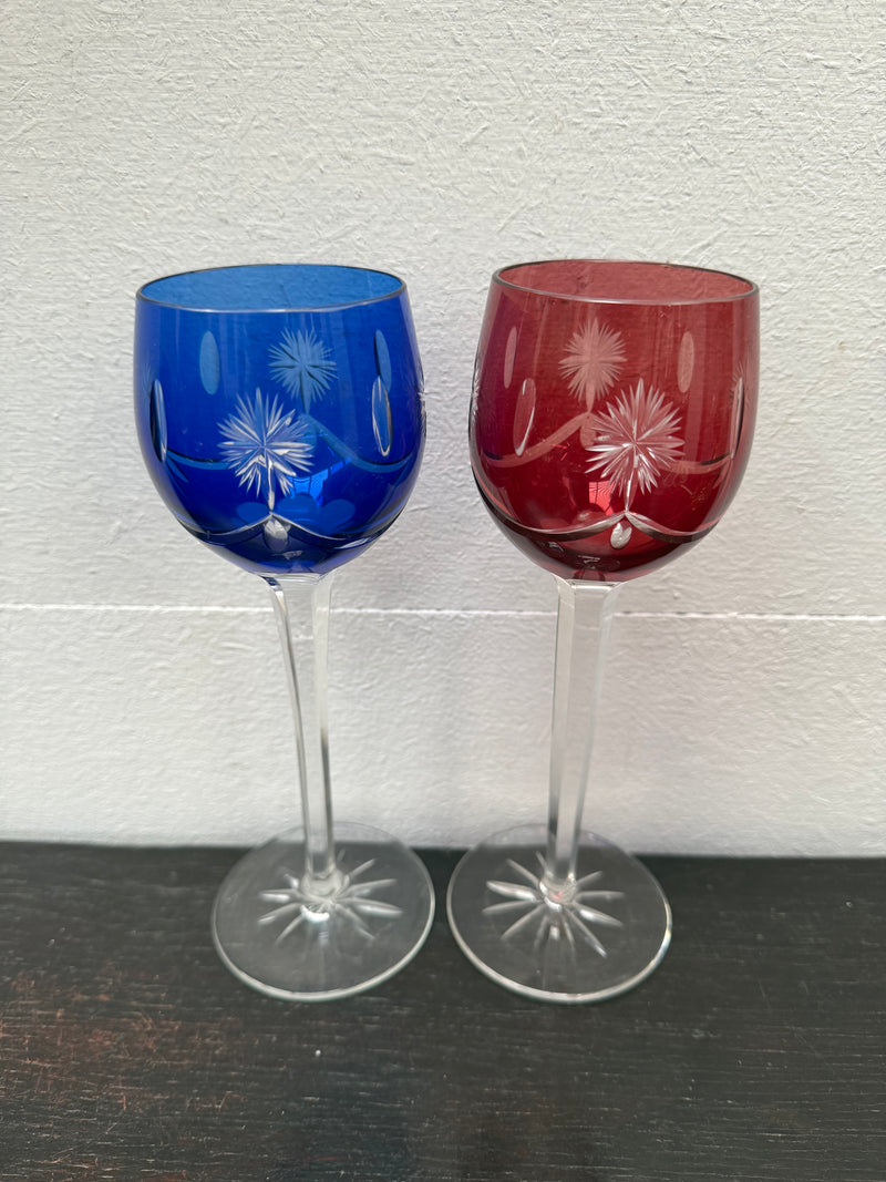 Pair Vintage Bohemian Cobalt & Ruby Wine Glasses