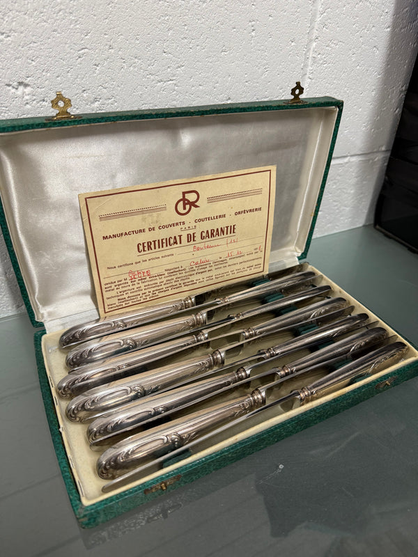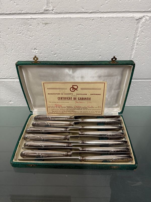 Pairs made vintage set of 12 French Silver Plated knifes of high quality in Original Box with certificate. In good original condition. Please view photos as they help to from part of the description and condition.